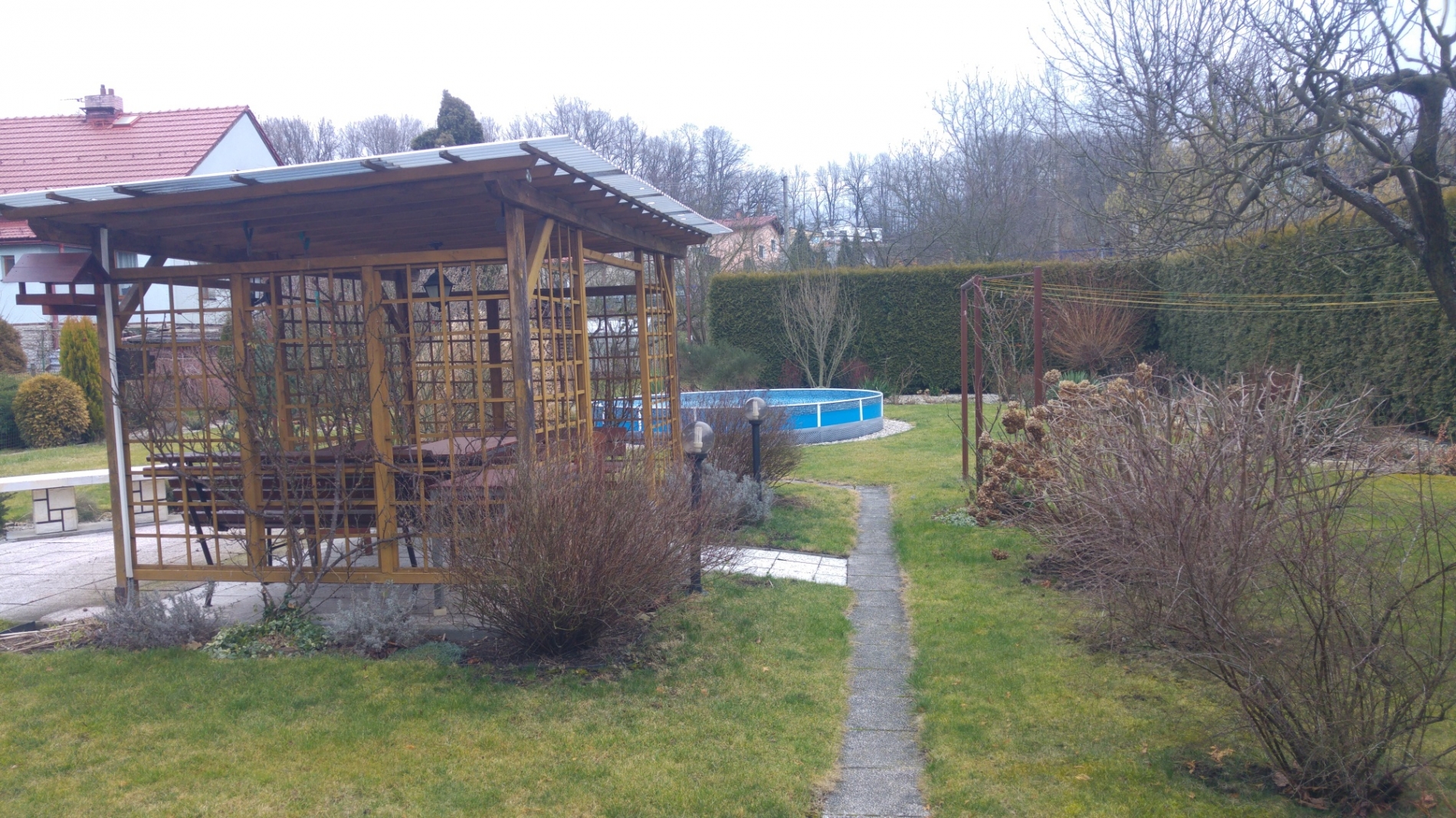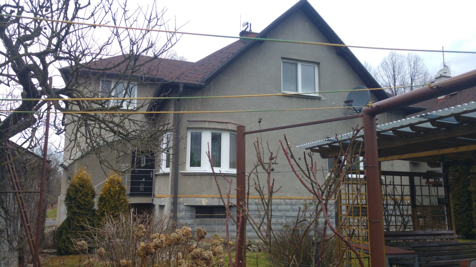 Rodinný dům je samostatný objekt a má jedno nadzemní podlaží. Dům je podsklepený a je zde vybudováno obytné podkroví. Zdroj informace o době výstavby: osoba přítomná při prohlídce nesdělila dobu výstavby, doba výstavby stanovena odhadem, rok výstavby: 1950. Základy RD jsou betonové, objekt je cihlové konstrukce, stropy jsou s rovným podhledem. Střecha je sedlová, valbová, střešní krytinu tvoří asfaltový šindel a klempířské prvky jsou úplné. Vnější omítky jsou tvořeny břízolitem a zateplení pláště není provedeno. Podlahová plocha činí 149,24 m2. Podlahová plocha vč. příslušenství činí 219,60 m2. Vnitřní omítky jsou vápenocementové. Jsou zde použita plastová okna s dvojsklem, v celém objektu s žaluziemi. Obytné prostory jsou orientovány na severozápad, jihovýchod. V koupelně se nachází klasická vana, umyvadlo a WC je vybaveno klasickou toaletou. V domě jsou použity dřevěné plné interiérové dveře, mají dřevěné zárubně a vchodové dveře jsou dřevěné. Kuchyně je vybavena kuchyňskou linkou bez vestavěných spotřebičů. Osvětlovací techniku tvoří lustry. Obytné místnosti mají na podlaze položeny koberce, v kuchyni je položena keramická dlažba, v koupelně je položena keramická dlažba a v chodbě je keramická dlažba. Ostatní místnosti mají na podlaze koberce. Součástí vybavení domu je digestoř. V domě je zavedena elektřina o napětí 230V a je připojen k rozvodné síti elektrického proudu. Do objektu je zaveden vodovod, je napojen na veřejnou kanalizaci a rozvod zemního plynu je připojen. V domě je topení řešeno ústředně plynovým kotlem a topná tělesa představují závěsné radiátory. V domě je pro ohřev vody instalován bojler. V kuchyni a ložnici je patrná spodní vlhkost vnějšího zdiva, v obývacím pokoji v jihovýchodním rohu u stropu patrná vlhkost. Na pozemku se nachází: okrasné dřeviny, ovocné dřeviny a pozemek je oplocen pletivem do ocelových sloupků. Sklon pozemku je rovinatý. K objektu je bezproblémový přístup po zpevněné obecní cestě. Parkovací možnosti jsou na vlastním pozemku. Součástí jsou tyto venkovní stavby: garáž (vnitřek nebyl zpřístupněn), dřevěný zahradní domek, pergola. BYLA PŘEDLOŽENA NÁJEMNÍ SMLOUVA.