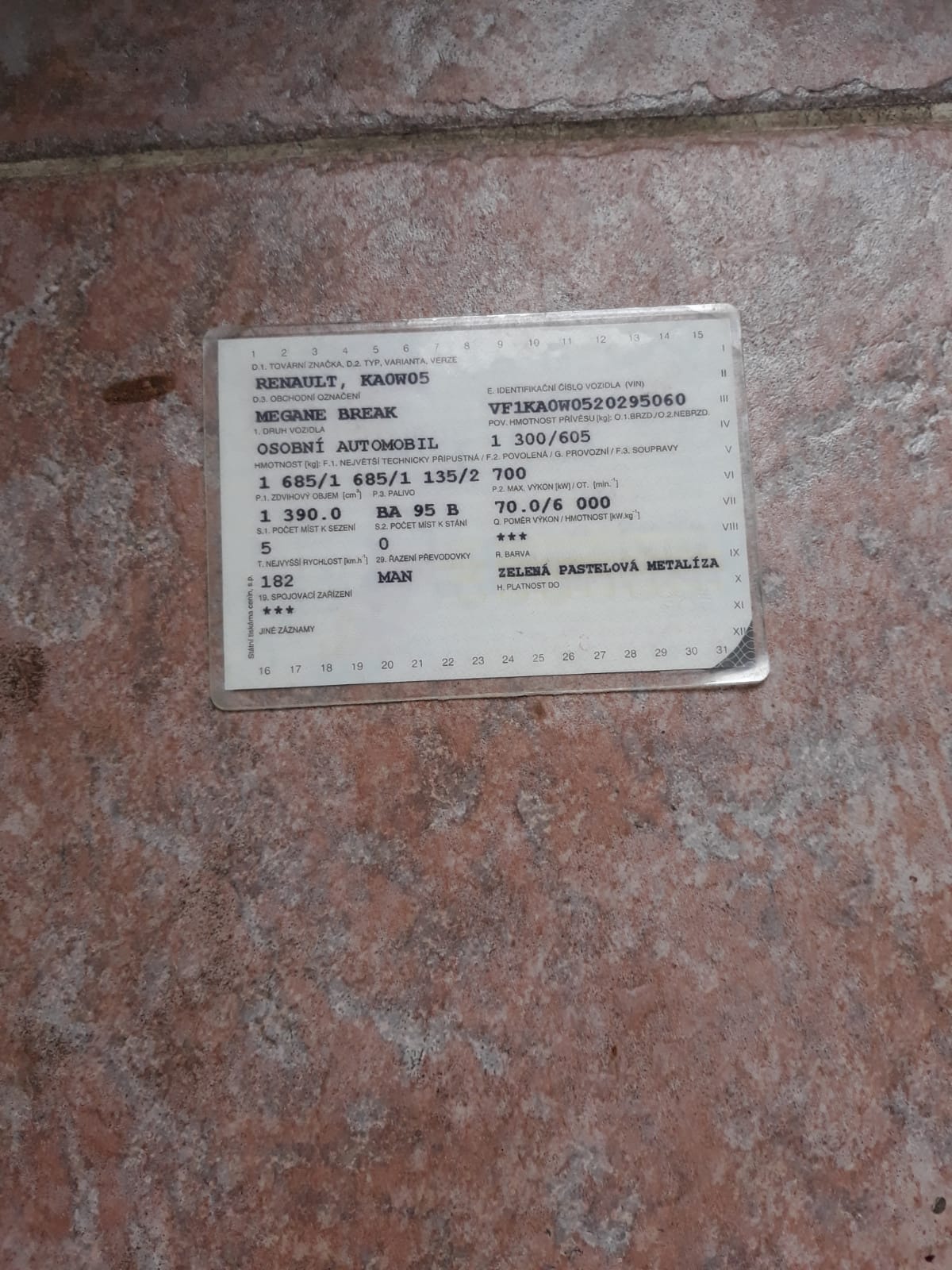 -osobní automobil značky Renault Megane Break Kombi, r.v. 1999, RZ 4U3 0249, VIN: VF1KA0W0520295060
