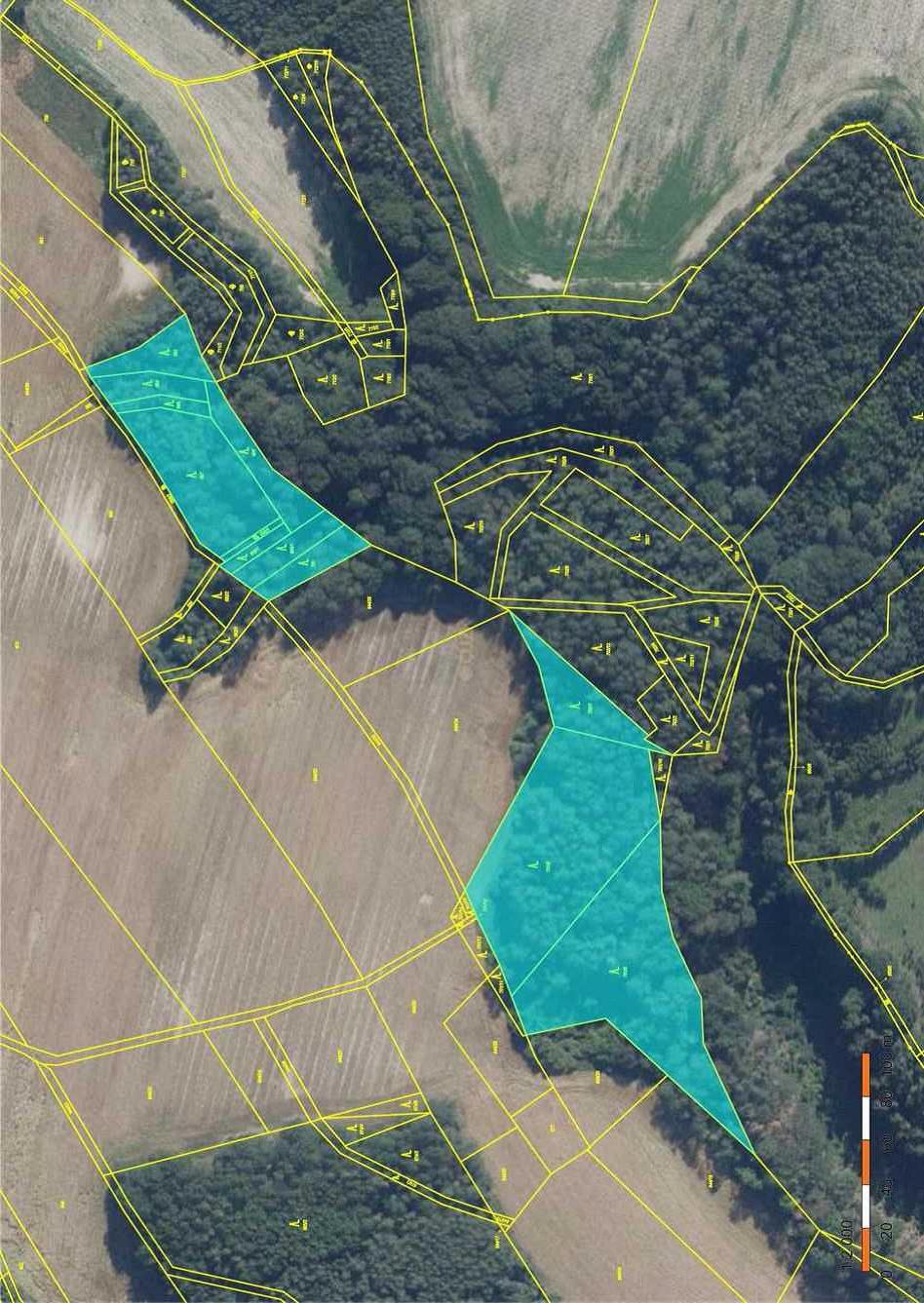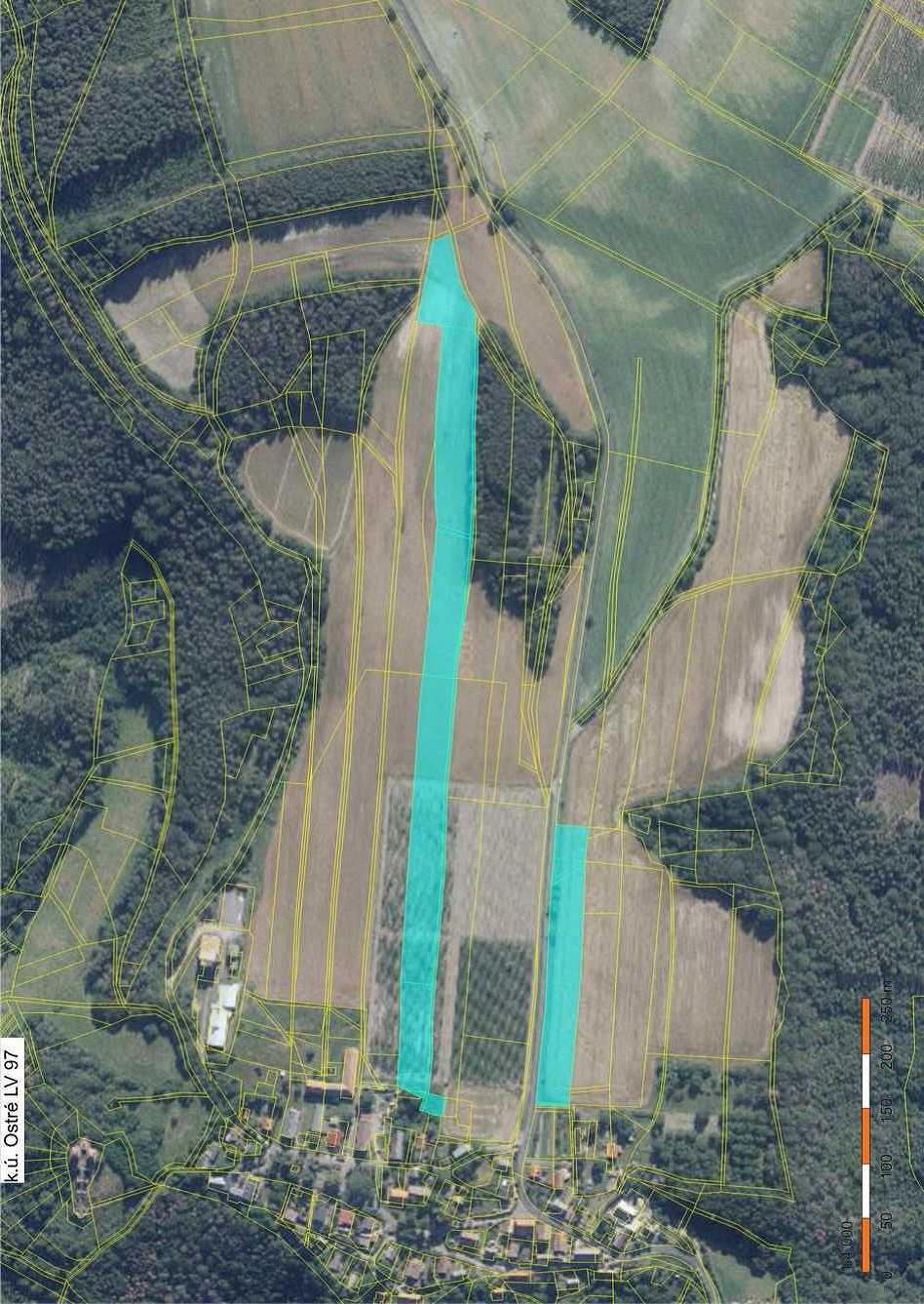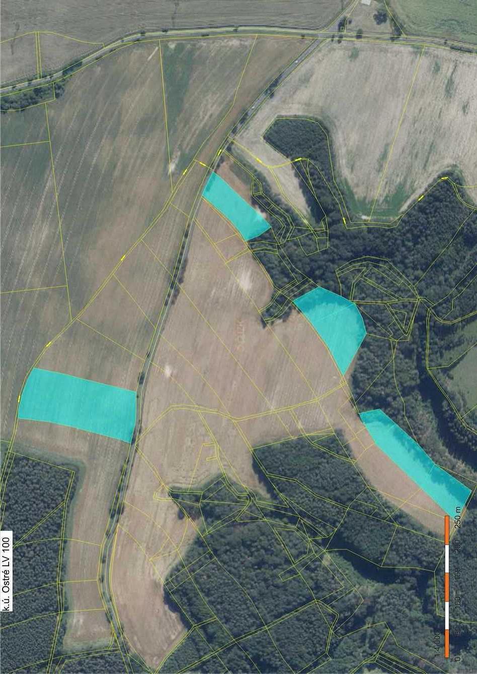Pozemky zapsané na LV 100 v k.ú. Ostré- Zemědělsky obdělávané pozemky jsou součástmi rozsáhlejšího celku.