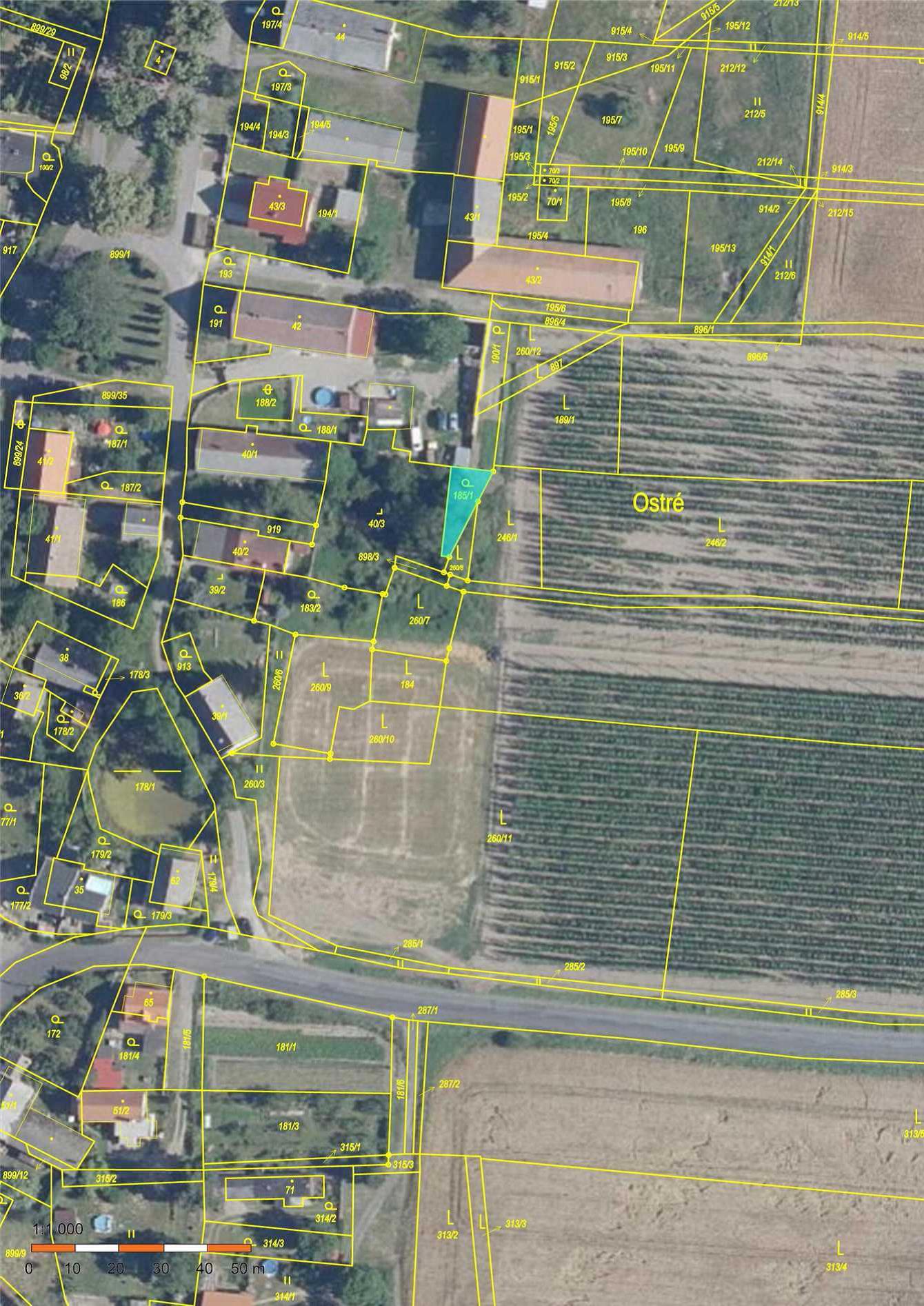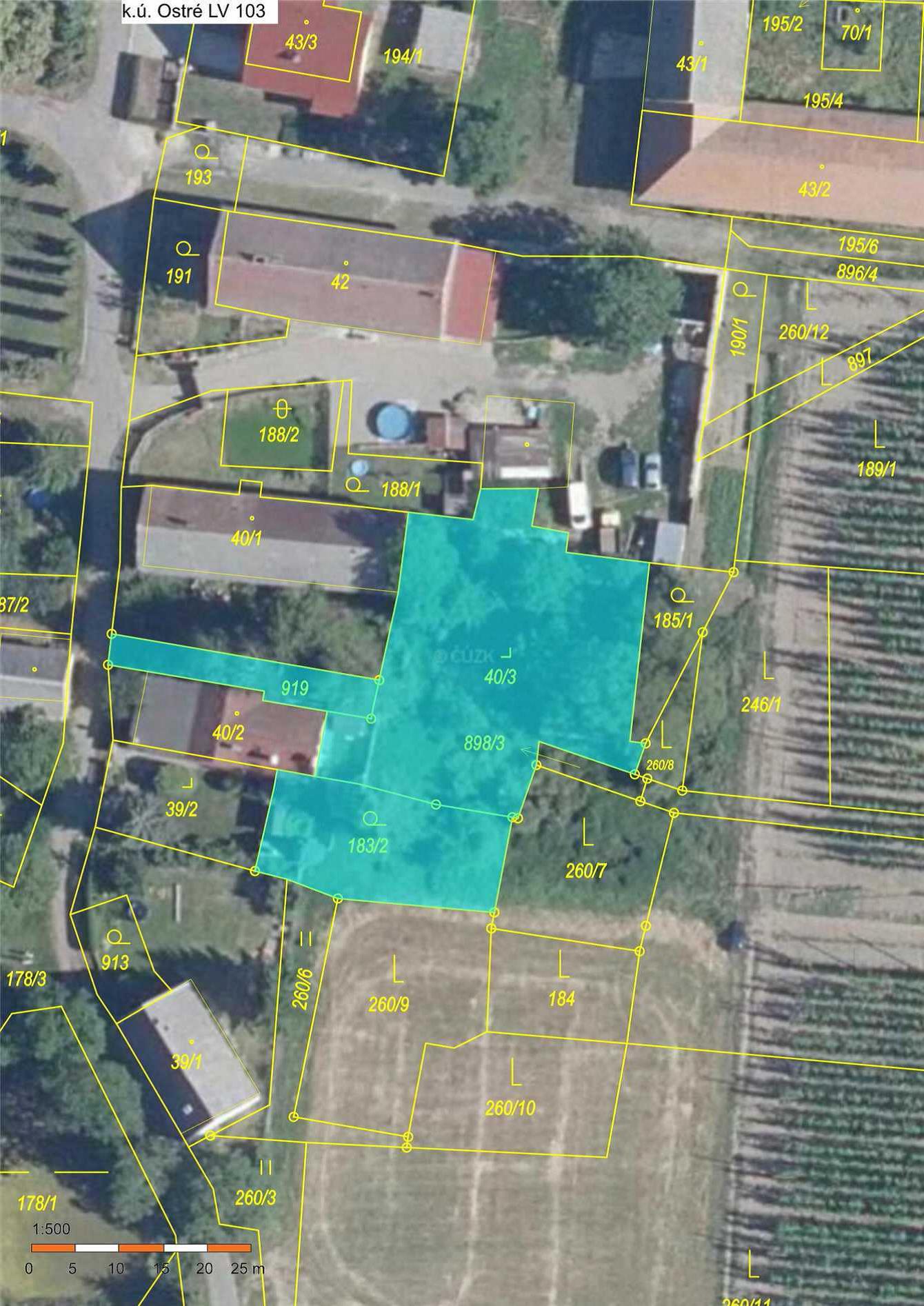 Pozemky zapsané na LV 103 v k.ú. Ostré- Pozemky tvoří funkční celek, který je přístupný po p.č. 919 z místní komunikace. Částečně jsou však pod společným oplocením s p.č. st. 40/2 a p.č st. 39/2 (jiný vlastník). Tyto pozemky jsou podle územního plánu obce v zastavěném území určené pro bydlení venkovské, resp. bydlení individuální. Nacházejí se v ochranném pásmu nemovité kulturní památky, památkové zóně. Na p.č. st. 40/3 jsou zbytky bývalého stavení.