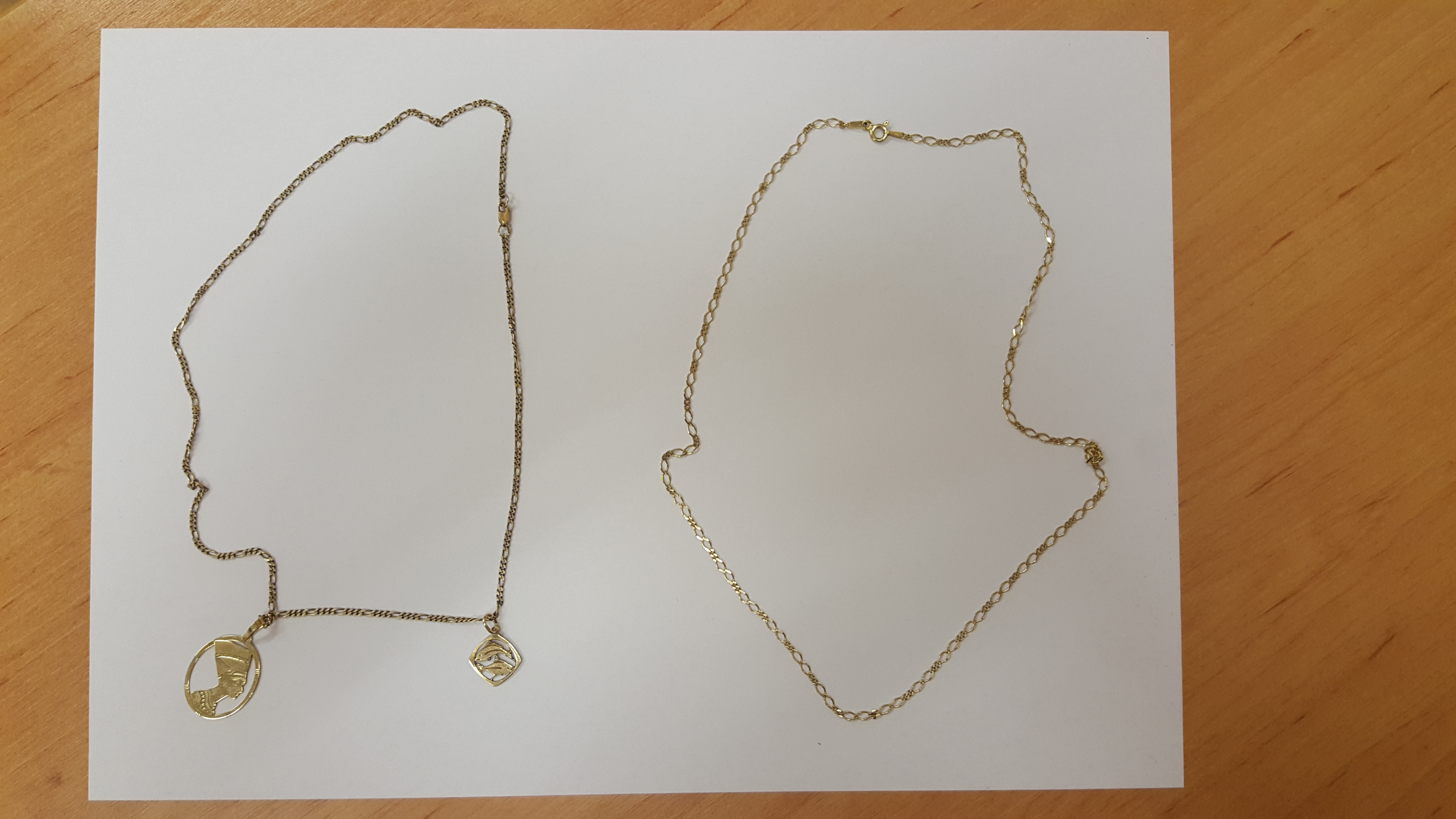 - 2 řetízky ze žlutého kovu a 2 přívěsky ze žlutého kovu o celkové hmotnosti 8 g v hodnotě 5 767,- Kč,