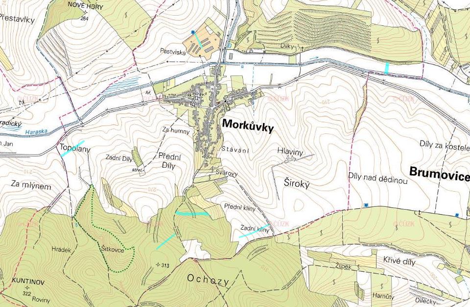 vodního toku. Vzhledem ke skutečnosti, že podobné pozemky jsou spolu se zemědělskými pozemky běžně obchodovány, jsou při výpočtu ve srovnání přiřazeny právě k zemědělským pozemkům. Celková výměra pozemků činí 15542 m2. Dle územního plánu obcí se jedná o plochy zemědělské, plochy přírodní, plochy smíšené nezastavěného území, příp. plochy vodní. Pozemky parc. č. 733/1, 733/2, 800 v katastrálním území Morkůvky jsou v katastru nemovitostí vedeny jako lesní pozemky. Pozemky plní funkci lesa. Na pozemcích se nachází převážně dub zimní, minoritně pak akát a habr, stáří 86, resp. 87 let. Celková výměra pozemků činí 8506 m2. Dle územního plánu obce se jedná o plochy lesní. Pozemek parc. č. 2011/121 v katastrálním území Morkůvky o výměře 1435 m2 je v katastru nemovitostí veden jako ostatní plocha se způsobem využití manipulační plocha. Pozemek se nachází uvnitř areálu bývalého zemědělského družstva v Morkůvkách a je využíván k manipulaci. Dle územního plánu obce se jedná o plochy zemědělské výroby.