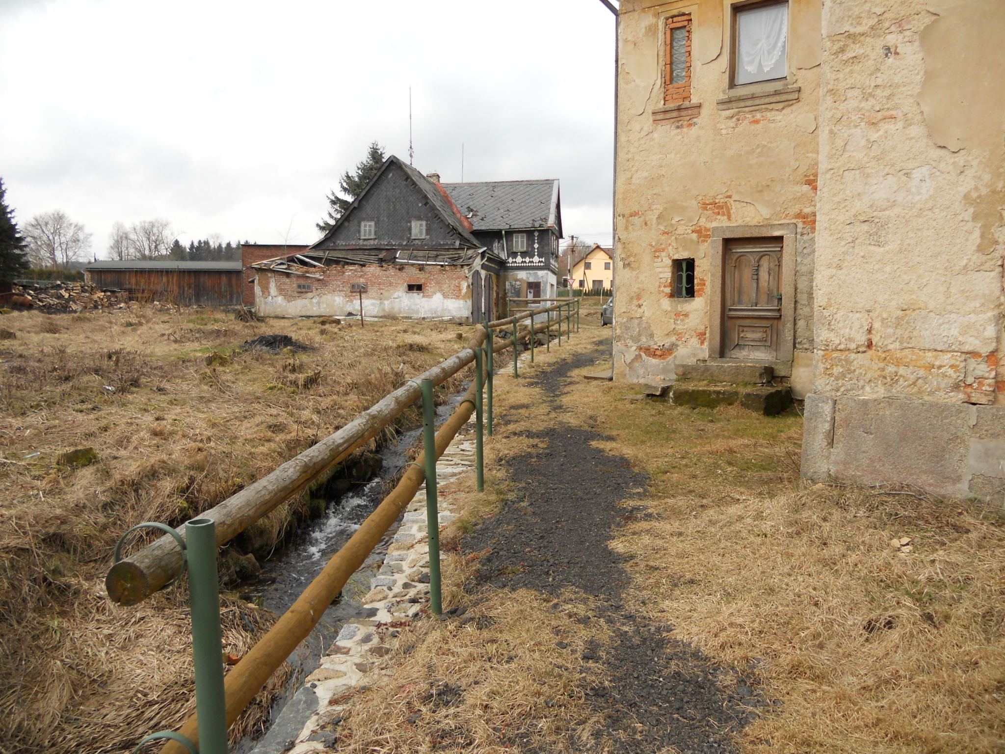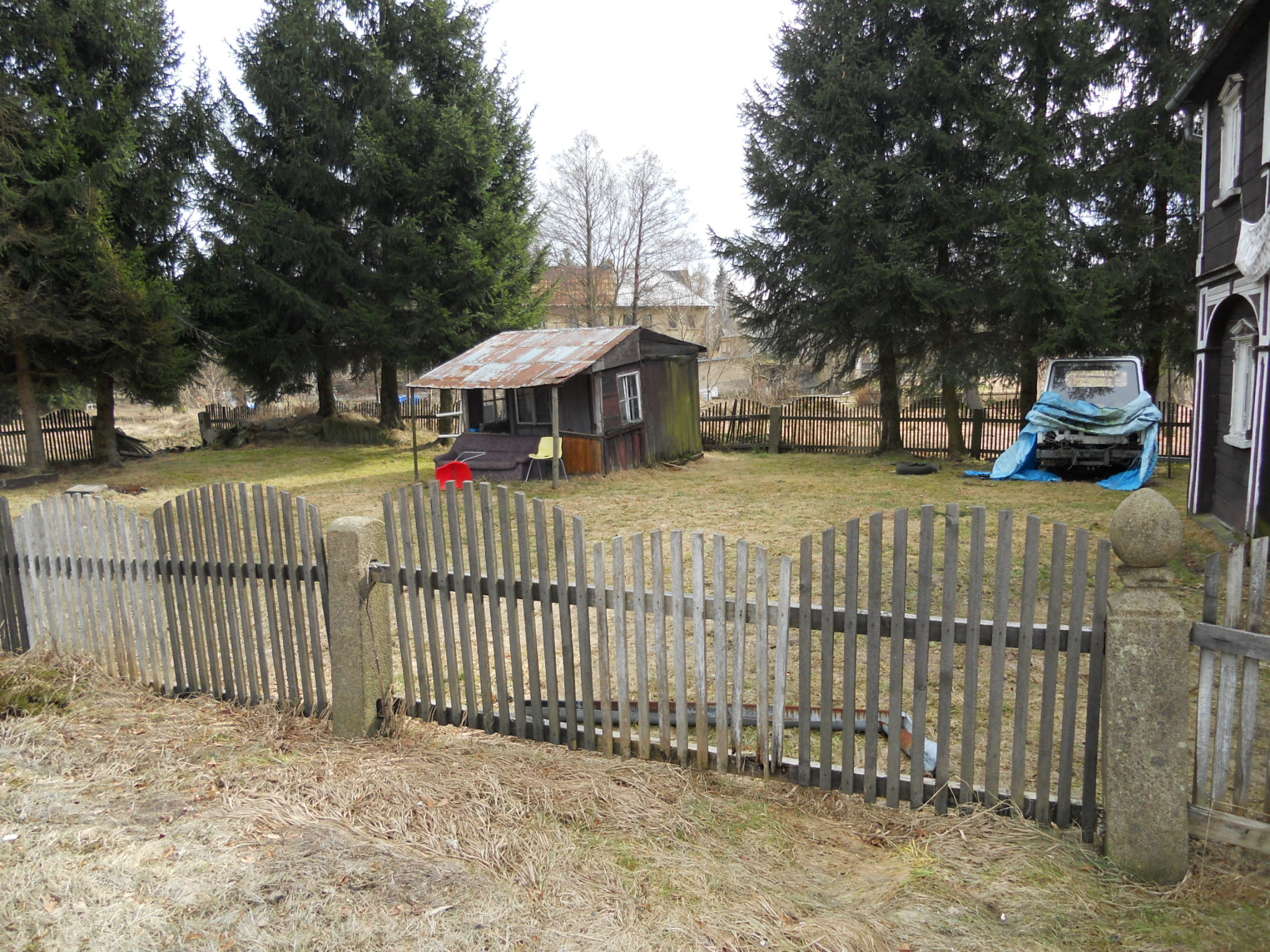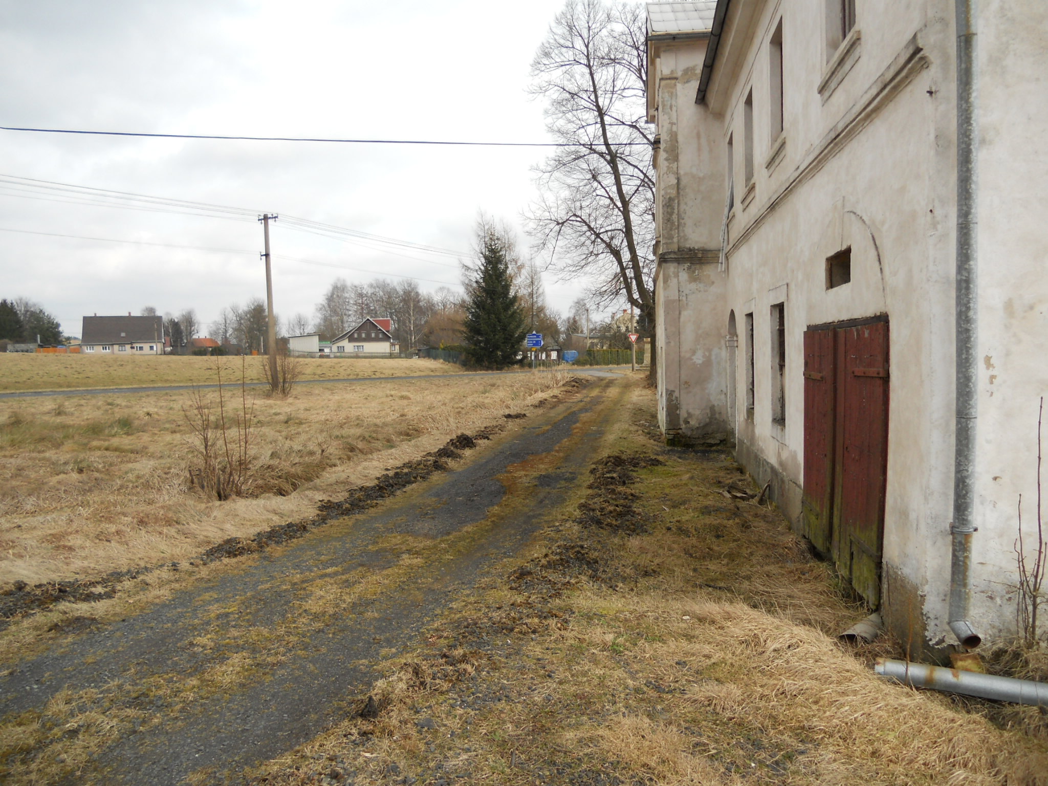 Na pozemku, který náleží k objektu, jsou okrasné dřeviny, pozemek je z části oplocen dřevěným plotem, z části oplocený není. Pozemek je rovinatý. Přístup k objektu je bezproblémový po nezpevněné obecní cestě. Možnost parkování je dobrá - přímo u objektu. Součástí jsou tyto venkovní stavby: Zahradní domek. Stav zahradního domku je dle vizuální prohlídky špatný.