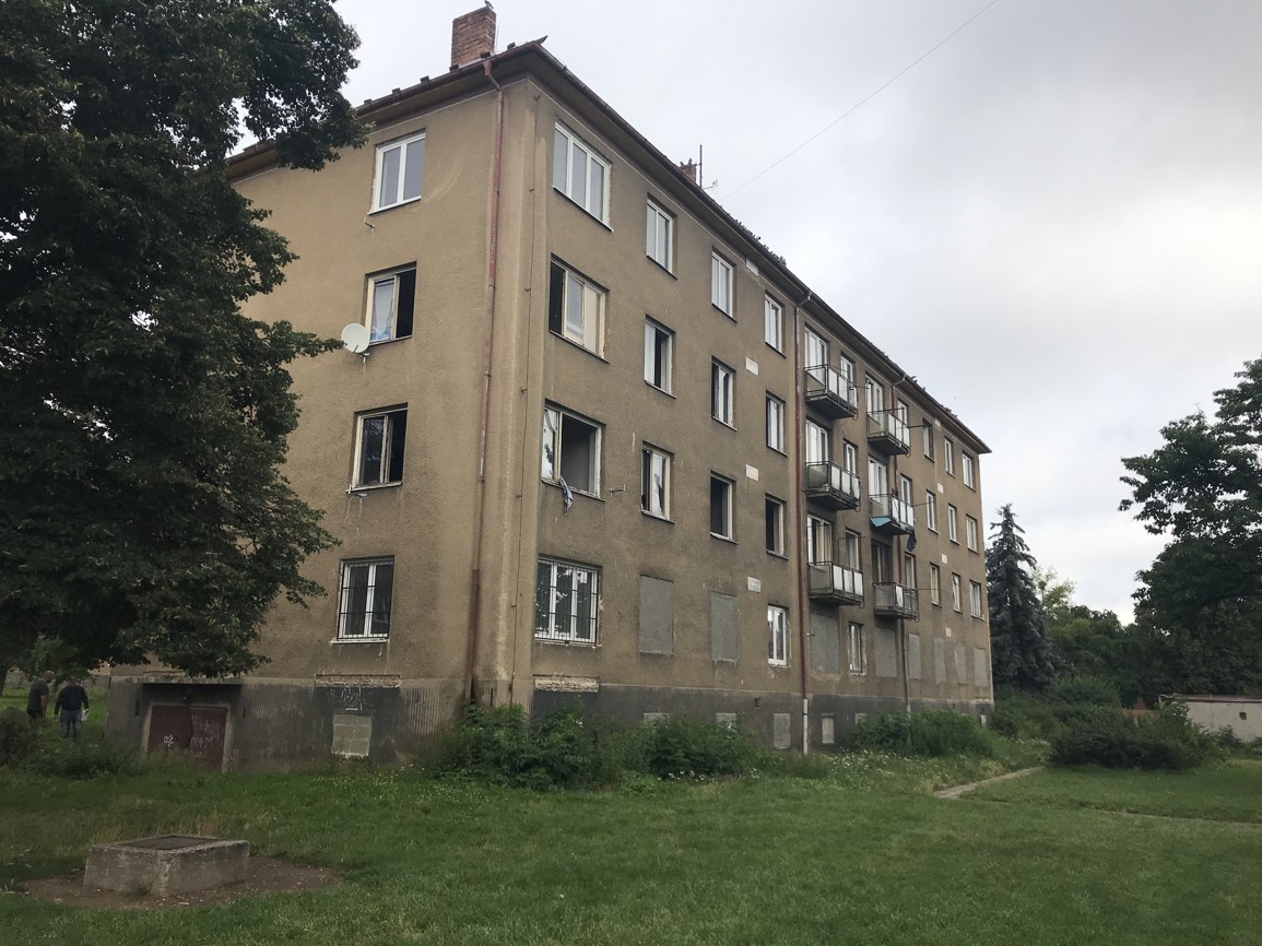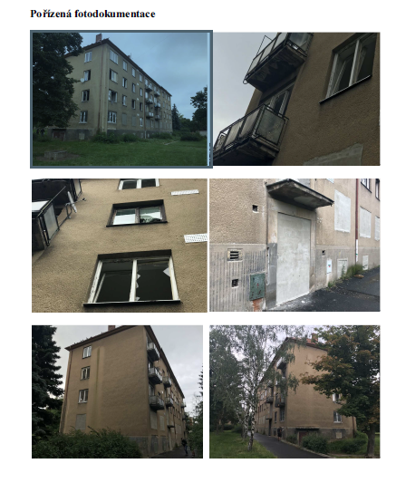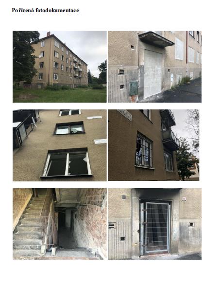 Do nemovitosti nebylo možné se dostat, jedná se o vybydlený bytový dům ve špatném stavu, který má zazděné vchody. Bytová jednotka je umístěna v typovém zděném bytovém domě. Stavba má celkem 4 nadzemní podlaží a má 1 podzemní podlaží. V objektu je půda a není zde vybudováno obytné podkroví. Odhadem byl objekt postaven v 60. letech 20. století. Dům je vybydlený, poničený, v současné době prázdný. Konstrukční prvky dožité. Bytový dům je vhodný k rekonstrukci. Bytová jednotka je v osobním vlastnictví. Je umístěna v 1.NP. Podlahová plocha bytu činí 61.8 m2. K bytu náleží jako příslušenství sklepní prostory o výměře 3,1 m2. Podlahová plocha vč. příslušenství činí 64.9 m2. Vnitřní vybavení bytu nebylo zjištěno - předpokládá se zcela dožitý či poničený stav. Objekt je odpojen od dodávky elektřiny. Možnost napojení na vodovod a kanalizaci. Vytápění bylo dříve řešeno pravděpodobně dálkově - neověřeno. Byt je před rekonstrukcí.