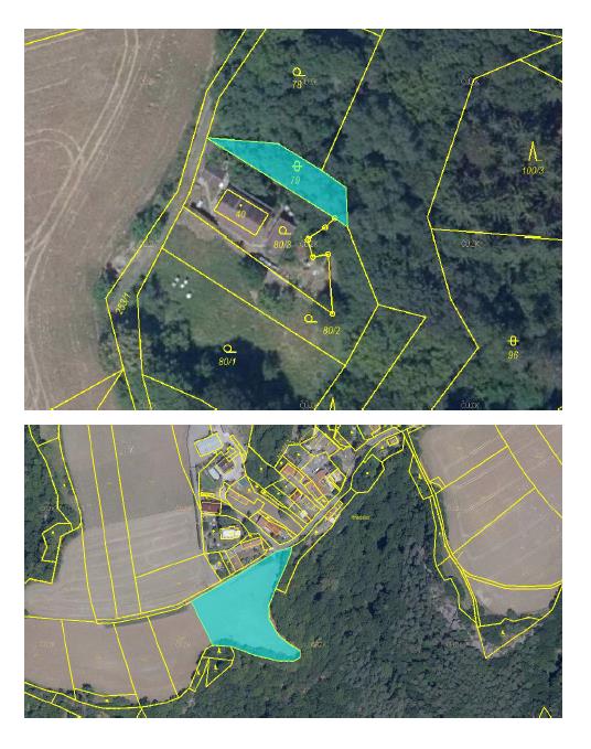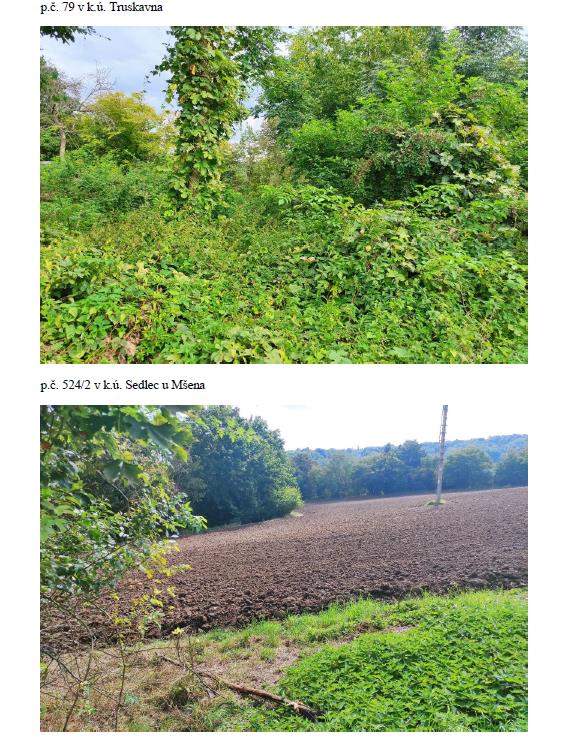 Pozemek č. 524/2 slouží k zemědělským účelům. Jedná se o aktivně využívanou ornou půdu o rozloze 6.281 m2. Územní plán stanoví, že plocha pozemku je regulována jako - plochy smíšené nezastavěného území. Na pozemku se nenacházejí trvalé porosty, je bez oplocení. Pozemek je mírně svažitý. K pozemku je bezproblémový přístup po zpevněné obecní cestě. Je bez staveb. Pozemek je situovaný v části obce, která je stavebně nesrostlá se sídelní částí obce. Pozemek p.č. 79 v k.ú. Truskavna se nachází v nezastavěném území. V KN je veden jako - ostatní plocha - neplodná půda. Na pozemku se nachází nelesní porost. Pozemek je o rozloze 187 m2. Plocha pozemku je dle územního plánu regulovaná jako plochy smíšené nezastavěného území. Na pozemku se nachází porost jasanu různého věku, s pokrytím cca 50 % pozemku, dále je pozemek plně pokryt buřinou a ostružiním, není oplocený. Pozemek je svažitý. Přístup je prakticky přes soukromý pozemek cizího subjektu - věcné břemeno ve prospěch majitele oceňovaného objektu není zřízeno, neboť s veřejnou cestou pozemek sousedí pouze v jednom bodě. Pozemek je bez staveb.