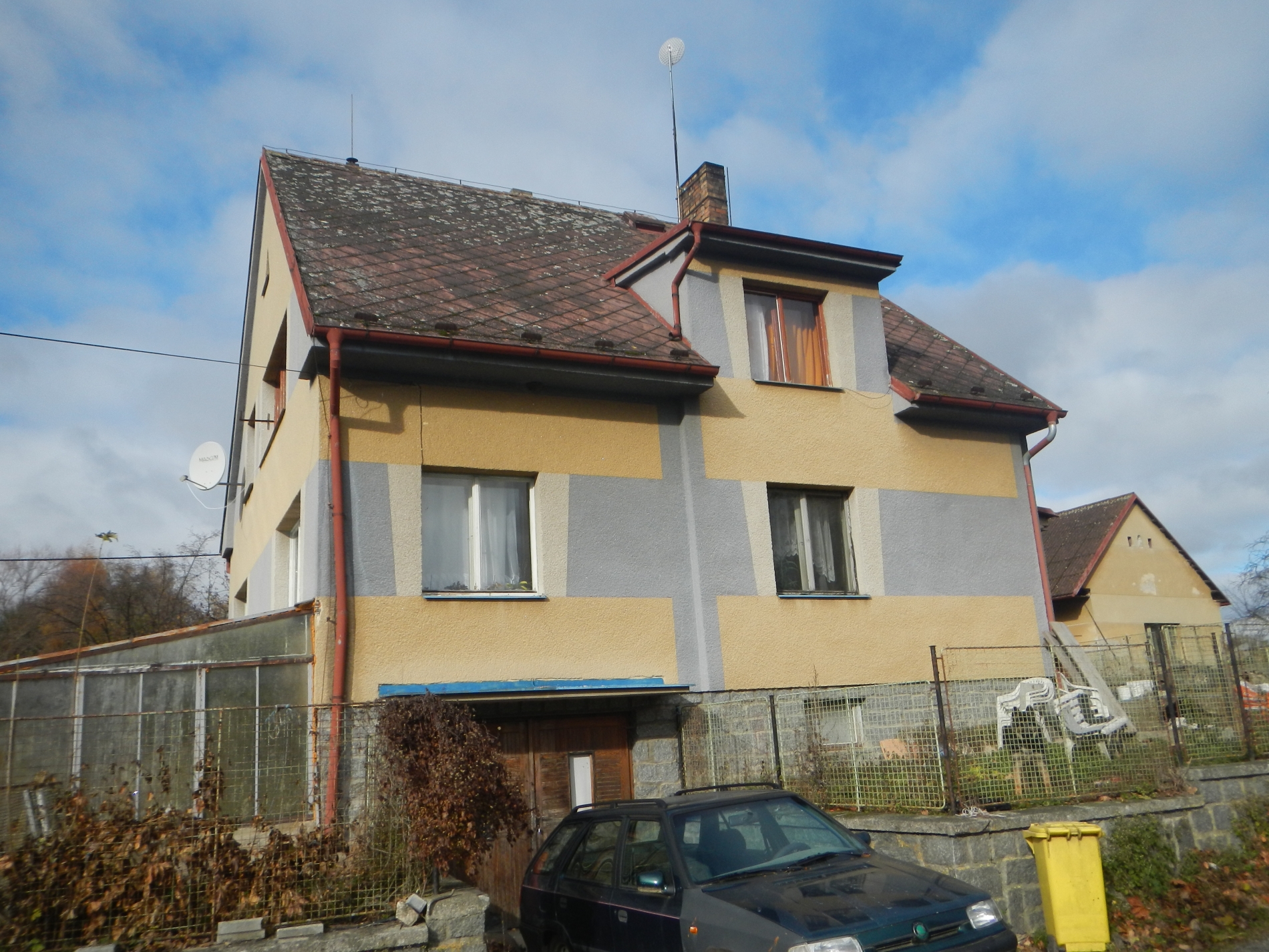 Rodinný dům byl postaven jako samostatný objekt a má jedno nadzemní podlaží. Dům je celkově podsklepený, v části se nachází půda a v části je vybudováno obytné podkroví. Odhadem byl objekt postaven v roce 1965. Základy jsou pravděpodobně železobetonové, konstrukce objektu je tvořena z tvárnic na žulové podezdívce. Střecha je sedlová, střešní krytina je tvořena eternitovými šablonami a klempířské prvky jsou plechové. Vnější omítky jsou břízolitové a stavba není zateplena. Podlahová plocha činí odhadem 159 m2. Podlahová plocha vč. příslušenství činí odhadem 253 m2. Jsou zde zdvojená dřevěná okna, příslušenství oken chybí. Obytné prostory mají orientaci na jihovýchod. Vchodové dveře jsou dřevěné. Do objektu je zavedena elektřina o napětí 230V a dodávky zajišťuje rozvodná síť elektrického proudu. Objekt je napojen na studnu, odpadní vody jsou svedeny do jímky a rozvod zemního plynu není připojen. Dům je vytápěn ústředně pomocí kotle na tuhá paliva. V domě je pro ohřev vody instalován bojler. Stěny objektu jsou poškozené, střecha vykazuje známky poškození, okna vykazují známky poškození, je zde patrná špatná izolace střechy nad verandou. Rodinný dům nebyl zpracovateli zpřístupněn, jeho stav vykazuje známky zanedbané průběžné péče, jeho stav je hodnocen jako stav před rekonstrukcí. Na pozemku se nachází trvalé porosty se zanedbanou pěstební péčí, pozemek je oplocen dřevěným plotem s podezdívkou. Samotný pozemek je mírně svažitý. K objektu je bezproblémový přístup po zpevněné obecní cestě. Je zde možnost parkování na vlastním pozemku.