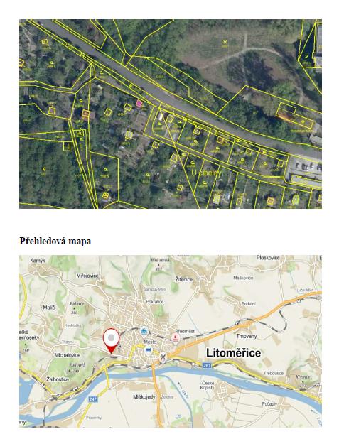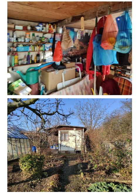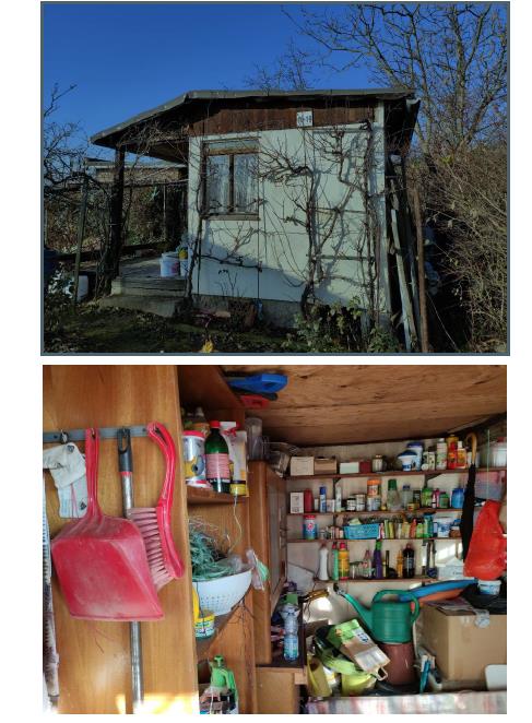 Jiná stavba bez č.p./č.e slouží jako zahradní chatka, respektive jako kolna na uskladnění nářadí v zahrádkářské kolonii. Zahradní chatka je vystavěna jako samostatná stavba a má jedno nadzemní podlaží. Stavba nemá podsklepení, není zde půda a nemá vybudované obytné podkroví. Na základě sdělení osoby přítomné během prohlídky byl objekt postaven v roce 1970. Základy jsou tvořeny z betonu bez izolace, objekt je montovaný na bázi dřevní hmoty, stěny mají tloušťku 5 cm a stropy jsou z dřevěných trámů. Zahradní chatka má nízkou sedlovou střechu, střešní krytinu tvoří živičná lepenka a klempířské prvky jsou plechové. Stavba není zateplena. Podlahová plocha činí 14 m2. Podlahová plocha vč. příslušenství činí 14 m2. Stavba leží na pozemcích jiného majitele. Úprava vnitřních povrchů stěn je tvořena dřevěným obitím. Je zde jednoduché dřevěné okno. Obytné prostory jsou orientovány na východ. Koupelna zde není. V objektu jsou dřevěné vchodové dveře. Kuchyně zde není. V objektu není žádná osvětlovací technika. V místnosti je prkenná podlaha (objekt má jednu místnost používanou na uskladnění nářadí). Další vybavení se v objektu nenachází. Do objektu není zavedena elektřina a přípojka zdroje elektrického proudu chybí. Vodovod není zaveden, v objektu chybí řešení odpadů a rozvod zemního plynu není připojen. Objekt nemá řešené vytápění. Stěny objektu jsou podstandardního provedení, střecha je provedena podstandardně, okna jsou provedena podstandardně, podlahy v objektu jsou podstandardního provedení, objekt je bez vybavení a objekt je bez rozvodů. Objekt je vhodný k rekonstrukci. Na okolním pozemku se nachází: okrasné dřeviny, ovocné dřeviny, pozemek je součástí zahrádkářské kolonie a je oplocen pletivem do ocelových sloupků. Samotný pozemek je rovinatý. K objektu se lze dostat bez problému po nezpevněné obecní cestě. Možnost parkování je dobrá - v blízkosti objektu. Pozemek není součástí dražby, je jiného vlastníka.