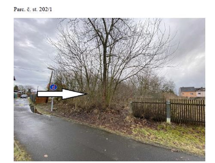 Pozemek parc. č. st. 202/1, zapsaný v katastru nemovitostí jako zahrada, o výměře 809 m2. Územní plán stanoví, že plocha pozemku je regulována jako „BI - bydlení individuální městského a příměstského typu“. Na pozemku jsou náletové porosty, bez vlastního oplocení, lemován ploty sousedních pozemků. Samotný pozemek je rovinatý. K pozemku lze přijet bez problému po zpevněné obecní cestě. Pozemek se nachází v klidné lokalitě bez zdraví ohrožujících vlivů a v docházkové vzdálenosti od objektu je zeleň v podobě lesů a luk. Pozemek se nachází v lokalitě s nízkým nebezpečím výskytu povodně (území tzv. 100leté vody).