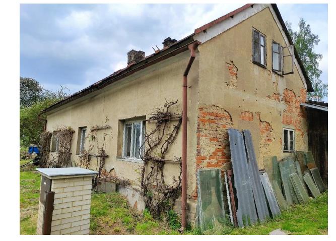 Rodinný dům byl postaven jako samostatný objekt a má jedno nadzemní podlaží. Dům nemá podsklepení, není zde půda a disponuje vybudovaným obytným podkrovím. Objekt byl postaven odhadem v roce 1930. Základy jsou smíšené, konstrukce objektu je cihlová, tloušťka stěn je 40 cm a stropy jsou dřevěné trámové. Má sedlovou střechu, střešní krytinu tvoří plech s nátěrem a klempířské prvky jsou pozinkované. Vnější omítky jsou vápenocementové a stavba není zateplena. Dispozičně je dům 5+kk. V domě se nachází zádveří o výměře 2,50 m2, koupelna o výměře 5,20 m2, WC o výměře 1,00 m2, chodba o výměře 6,50 m2, pokoj o výměře 9,40 m2, pokoj s kuchyňským koutem o výměře 24,40 m2, pokoj o výměře 15,70 m2, spíž o výměře 5,10 m2, chodba o výměře 15,30 m2, pokoj o výměře 25,00 m2, pokoj o výměře 20,30 m2. Podlahová plocha činí 130,40 m2 Vnitřní omítky jsou vápenocementové. Jsou zde instalována špaletová okna. Orientace obytných prostor je na jihovýchod, jihozápad. V koupelně se nachází klasická vana, umyvadlo a WC je vybaveno klasickou toaletou. V domě jsou dřevěné plné interiérové dveře, zárubně dveří jsou dřevěné a vchodové dveře jsou dřevěné. V kuchyni je instalována kuchyňská linka bez vestavěných spotřebičů. Pro osvětlení jsou použity lustry. V obytných místnostech je podlaha řešena: koberce, lino, prkenná podlaha, kuchyně má na podlaze lino, v koupelně jsou podlahy tvořeny keramickou dlažbou a v chodbě je položeno lino. Do objektu je zavedena elektřina o napětí 230V a dodávky zajišťuje rozvodná síť elektrického proudu. Obecní voda je odpojena a v současnosti je brána pomocí čerpadla ze studny, odpadní vody jsou svedeny do septiku a zemní plyn není zaveden do objektu, avšak je na hranici pozemku. Vytápění v domě je v současnosti lokální pomocí kamen a topná tělesa jsou závěsné radiátory (kotel chybí). V domě je pro ohřev vody využíván bojler. Stěny objektu jsou poškozené, střecha je provedena podstandardně, okna domu jsou zastaralá, podlahy v domě jsou zastaralé, objekt má vybavení v dezolátním stavu a rozvody jsou zastaralé. Rodinný dům je před rekonstrukcí. Na pozemku se nachází: okrasné dřeviny, ovocné dřeviny, pozemek je bez oplocení. Sklon pozemku je rovinatý. K objektu je bezproblémový přístup po zpevněné obecní cestě. Možnost parkování je na vlastním pozemku. K objektu náleží kolna