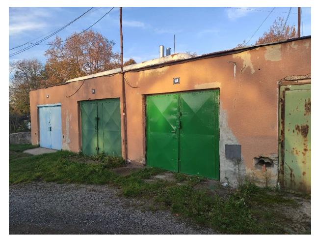 Garáž je přízemní, má jedno nadzemní podlaží, není podsklepená. Odhadem byl objekt postaven v roce 1975. Základy má betonové izolované, objekt je cihlové konstrukce, stěny mají tloušťku 30 cm a stropy jsou tvořeny dřevěnými trámy. Tvar střechy je sedlový, střešní krytinu tvoří živičná lepenka, s klempířskými prvky, které jsou pozinkované. Vnější omítky jsou vápenocementové a objekt není zateplen. Zastavěná plocha je 23 m2. Podlahová plocha je o rozloze 21,00 m2. Objekt má pravděpodobně vápenocementové vnitřní omítky. V objektu nejsou okna. Vrata jsou kovová dvoukřídlá a na podlaze je pravděpodobně cementový potěr. V garáži je pravděpodobně odpojena elektřina o napětí 230V. Vodovod není zaveden, odpadní vody nejsou v objektu řešeny a zemní plyn zde není zaveden. Objekt nemá řešené vytápění. Stěny objektu jsou relativně bez vad, okna v objektu chybí, podlahy v objektu jsou nejspíše bez závad, vybavení objektu je bez vad a rozvody jsou pravděpodobně zastaralé. Stav garáže je dobrý. Okolní pozemek není oplocen. Pozemek je rovinatý. K objektu je bezproblémový přístup po zpevněné obecní cestě.