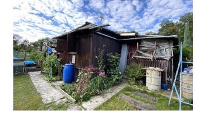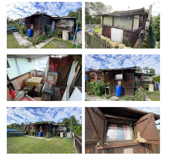 Nesoulad skutečného stavu se stavem zapsaným v katastru nemovitostí: obvod budovy podle katastrální mapy neodpovídá skutečnému stavu. Jednopodlažní zahrádkářská chatka s přiděleným číslem evidenčním. Stavba se nachází v uzavřené zahrádkářské kolonii a je situována na pozemku odlišného vlastníka (obecní pozemek), pozemky jsou pod správou zahrádkářského svazu, který přeúčtovává jednotlivým vlastníkům částku za pronájem pozemků dle velikosti užívaného pozemku. Základy má stavba pravděpodobně betonové bez izolace nebo v kombinaci beton/kámen, konstrukce objektu je dřevěná s oboustranným zaklopením konstrukce. Střecha sedlová v části pultová, střešní krytina je tvořena živičnou lepenkou a pro klempířské prvky byl použit plech. Vnější úprava pláště nátěrem. Okna dřevěná jednoduchá, dveře dřevěné. Vnitřní vybavení nebylo možné zjistit, jelikož objekt nebyl zpřístupněn. Pohledem přes okno bylo zjištěno, že chata je s poničeným či dožitým vybavením, delší dobu neobývaná (nejméně 6 let). Objekt je špatném stavu určený ke kompletní rekonstrukci. Podlahová plocha činí včetně nepovolené přístavby odhadem do 30 m2. V rámci kolonie je možné napojení na elektrickou síť. Stáří objektu nebylo zjištěno, odhaduje se nejméně na 60 let – zcela dožité.