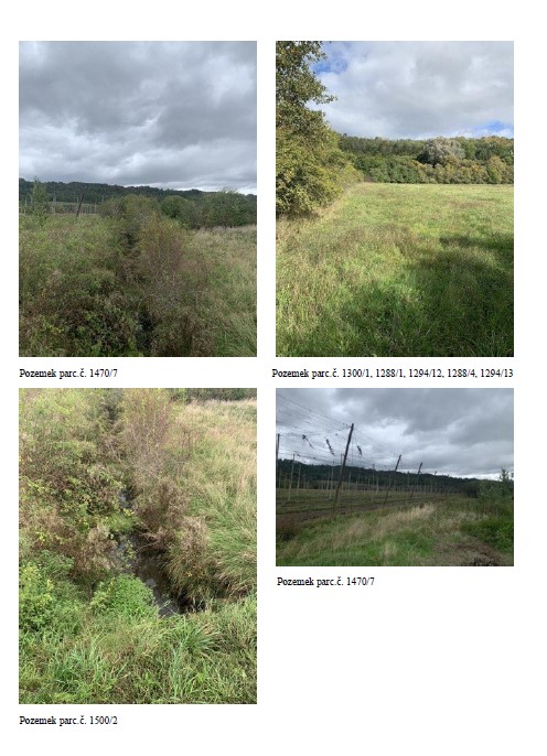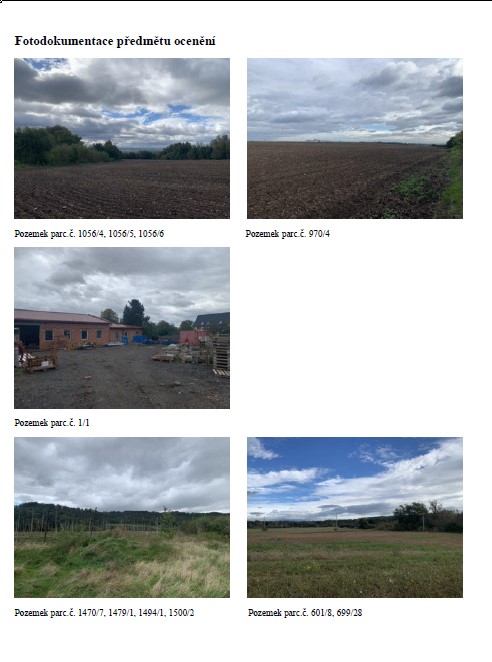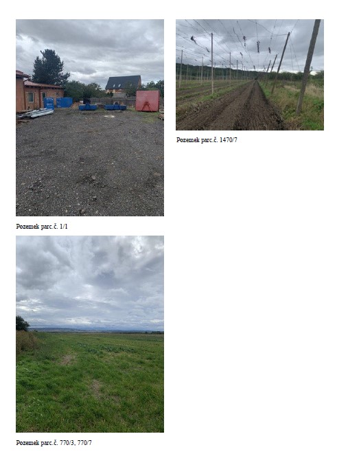 parc. č. 1300/1, 601/8, 699/28, 770/3, 770/7, 970/4, 1470/7, 1479/1, 1494/1, 1500/2 o celkové výměře 105359 m2 pozemky jsou užívané jako zemědělská plocha. Dle územního plánu jsou pozemky regulovány jako zemědělské plochy. Pozemky jsou umístěny v extravilánu obce. Přístup je řešen převážně přes soubor zemědělských pozemků ve vlastnictví jiných majitelů. Pozemek parc.č. 770/3 a 770/7 je přístupný přes nezpevněnou polní cestu ve vlastnictví státu (SPÚ). Na pozemku parc.č. 770/7 a 699/28 jsou umístěny prvky krajinné a ochranné zeleně, na pozemku parc.č. 601/8 jsou navrhovány. Přes pozemek parc.č. 699/28 vede vedení VN a jsou na něm umístěny dva sloupy VN. Zemědělské a lesní pozemky (LV 272, 167, 623, 337) jsou zapsány ve veřejném registru půdy a jsou obhospodařované Zemědělskou obchodní společností, Staňkovice, spol. s.r.o. Pozemek parc.č. 1470/7- chmelnice je užíván společností CHMEL spol. s.ro. Lesní pozemky: Jedná se o pozemky parc. č. 1056/4, 1056/5, 1056/6, 1288/1, 1294/12, 1288/4, 1294/13 o celkové výměře 2332 m2. Pozemky jsou užívané jako lesní plocha. Dle územního plánu jsou pozemky regulovány jako plochy přírodní. Pozemek parc.č. 1288/4 není v KN evidován jako lesní pozemek, ale tvoří s lesními pozemky jeden celek, proto je považován jako lesní. Pozemky jsou v lesních hospodářských osnovách evidovány jako bezlesí, mez na kraji lesa. Pro potřeby ocenění lesního porostu, který se na pozemcích ve skutečnosti nachází, je SLT odvozeno od sousedních pozemků. Přístup je řešen přes soukromý pozemek jiného subjektu, věcné břemeno přístupu ve prospěch majitele oceňovaného majetku není zřízeno. Pozemek leží na severním okraji obce a charakter okolí odpovídá neobydlené oblasti. Stavební pozemek: Jedná se o pozemek parc. č. 1/1 o celkové výměře 378 m2. Pozemek je stavební. Pozemek parc.č. 1/1 v k.ú. Staňkovice u Žatce spadá dle územního plánu do ploch smíšené výroby. Ve skutečnosti pozemek tvoří funkční celek s objektem č.p. 59 (zemědělská stavba – bývalá truhlárna) na pozemku parc.č. st. 1, která se nyní přestavuje na obytnou budovu, proto je na pozemek nahlíženo jako na stavební. Sklon pozemku je rovinatý. Pozemek není napojen na žádné inženýrské sítě, ty jsou přivedeny do objektu č.p. 59. Pozemek není oplocený a nenachází se na něm žádné porosty. Přístup je řešen přes soukromý pozemek parc.č. 1/5, 1/6, 1/7, 1/8 a st. 1 jiného subjektu, věcné břemeno přístupu ve prospěch majitele oceňovaného majetku není zřízeno. Pozemek leží v západním okraji obce a charakter okolí odpovídá rezidenční zástavby