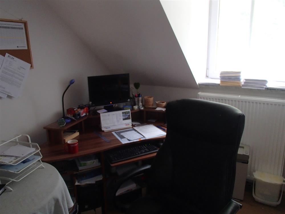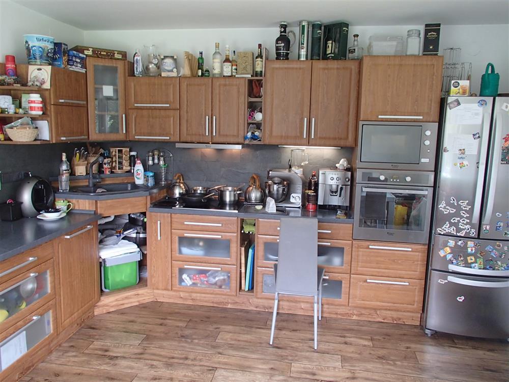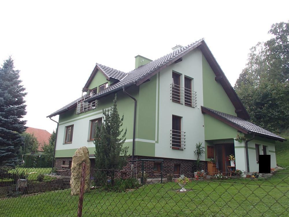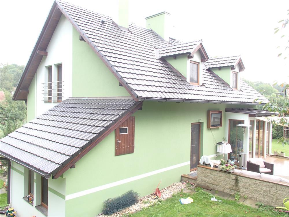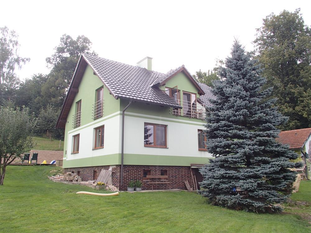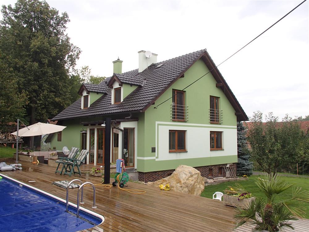 příčky uvažujeme 30 % zastavěné plochy. Užitná obytná plocha tedy činí po zaokrouhlení 246 * 0,7 = 172 m2. Užitná plocha příslušenství činí po zaokrouhlení 115 * 0,7 = 80 m2. Z výše uvedených důvodů nemusí popis a výměry odpovídat skutečnosti. Rodinný dům byl postaven jako samostatný objekt a má jedno nadzemní podlaží. Dům je částečně podsklepený, není zde půda a disponuje vybudovaným obytným podkrovím. Zdroj informace o době výstavby: ze znaleckého posudku, rok výstavby: 1977. V roce 2009 proběhla kompletní rekonstrukce (oprava střešní konstrukce, výměna krytiny a klempířských prvků, nové vnitřní i vnější omítky, obklady, schody, výměna oken za plastová s dvojsklem, nové podlahové krytiny, nové rozvody ÚT včetně radiátorů, nové rozvody vody, elektro, modernizace WC, koupelny a kuchyně). Základy jsou tvořeny z betonu s izolací, objekt je zděné konstrukce, stěny mají tloušťku 45 cm a stropy jsou hurdisky. Má sedlovou střechu, střešní krytinu tvoří pálená taška a klempířské prvky jsou měděné. Vnější omítky objektu: latexové, obklady z kabřince a plášť je zateplen polystyrenem. Objekt je dispozičně řešen jako 5+1. V domě se nachází předsíň, obývací pokoj, kuchyně, pokoj, ložnice, pokoj, pokoj, schodiště, koupelna, koupelna s WC, sklep, garáž, lodžie. Podlahová plocha byla odhadnuta výpočtem ze zastavěné plochy a činí 245,00 m2. Podlahová plocha vč. příslušenství činí 327,50 m2. Vnitřní omítky jsou vápenocementové. Jsou zde instalována plastová okna s dvojsklem, v celém objektu s žaluziemi. Orientace obytných prostor je na jih, východ, západ. V koupelně se nachází klasická vana, sprchový kout, umyvadlo a WC je vybaveno klasickou toaletou. Jsou zde použity tyto dveře: dýhované plné, dýhované prosklené, mají obložkové zárubně a vchodové dveře jsou plastové. V kuchyni se nachází kuchyňská linka s vestavěnými spotřebiči, elektrický sporák. Pro osvětlení jsou použity lustry. V obytných místnostech je lino, v kuchyni je položeno lino, v koupelně jsou podlahy tvořeny keramickou dlažbou a v chodbě je položena keramická dlažba. V ostatních místnostech je podlaha řešena: keramická dlažba, cementový potěr. Součástí vybavení domu je krb. Do domu je zavedena elektřina o napětí 230V a 400V a je napojen na rozvodnou síť elektrického proudu. Objekt je připojen na vodovodní řad, odpadní vody jsou svedeny do septiku a rozvod zemního plynu je připojen. Dům má ústřední topení pomocí plynového kotle a topná tělesa tvoří závěsné radiátory. Ohřev vody je řešen plynovým kombinovaným kotlem. Stěny jsou bez vad, střecha je bez vad, okna v objektu jsou bez vad, podlahy jsou bez vad, vady vybavení nejsou a rozvody v objektu jsou bez vad. Rodinný dům je v dobrém stavu. Na pozemku jsou okrasné dřeviny a pozemek je oplocen pletivem do ocelových sloupků. Sklon pozemku je mírně svažitý. Přístup k objektu je bezproblémový po zpevněné obecní cestě. Je zde možnost parkování na vlastním pozemku. K objektu náleží kolna, venkovní bazén se zpevněnou plochou, dětské hřiště.