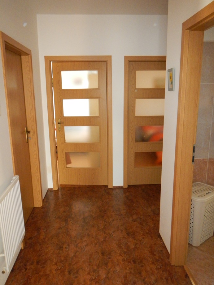 V obytných místnostech je linoleum, v ostatních místnostech jsou podlahy tvořeny keramickou dlažbou.