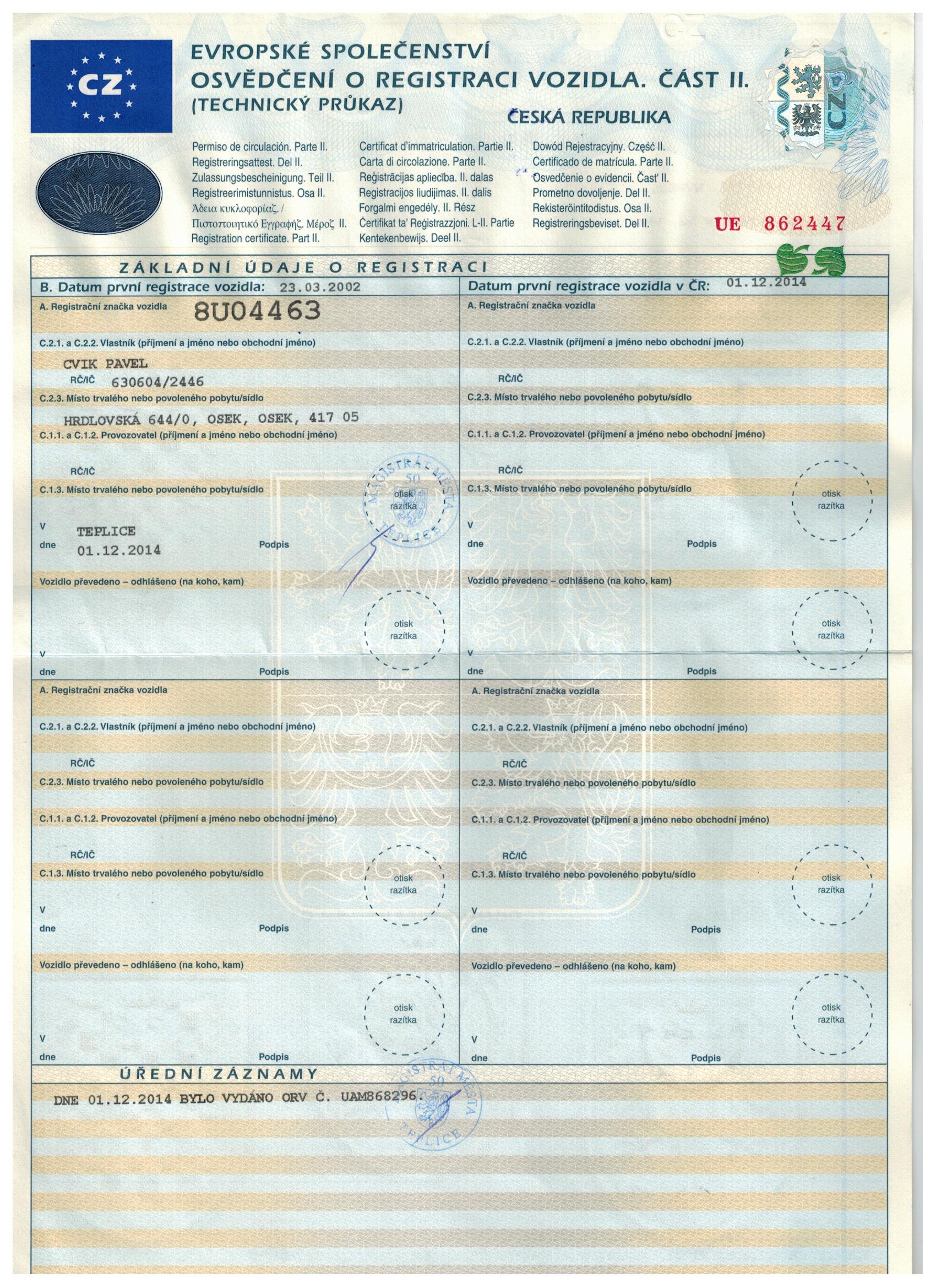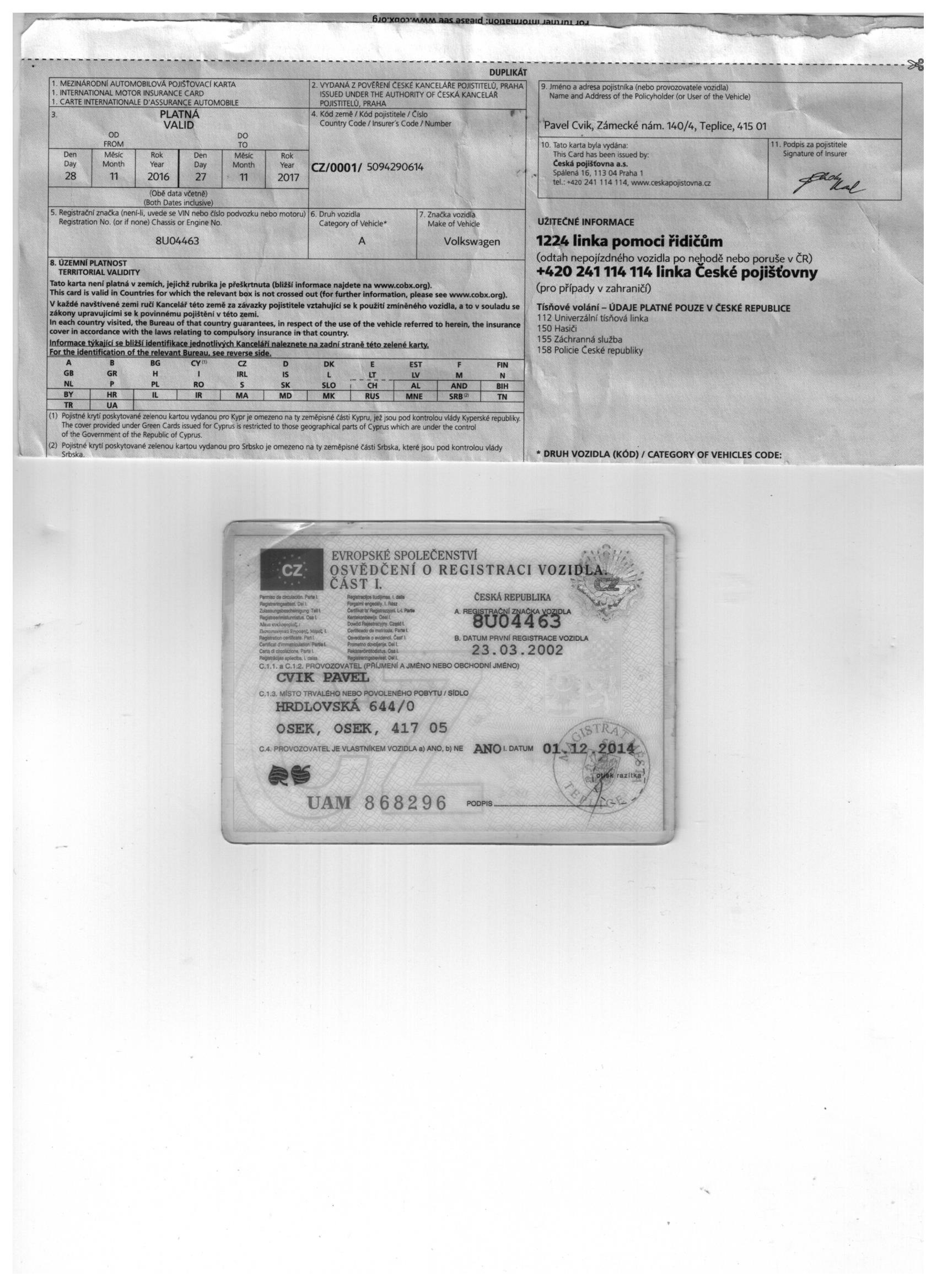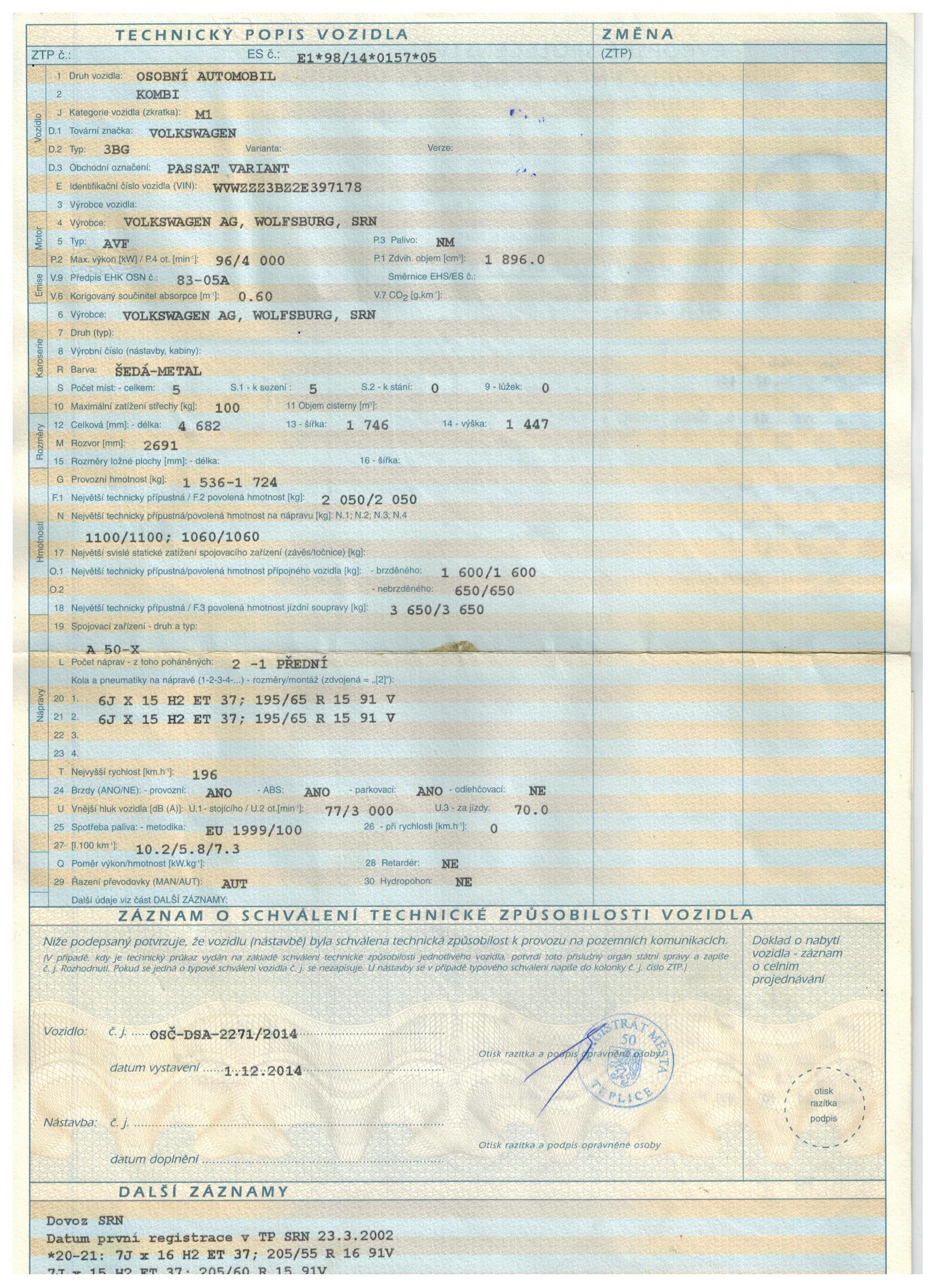- osobní automobil kombi, zn. VOLKSWAGEN PASSAT VARIANT, RZ: 8U0 44 63, VIN: WVWZZZ3BZ2E397178, barva: šedá- metal, vybaven úpravou řízení pro postižené