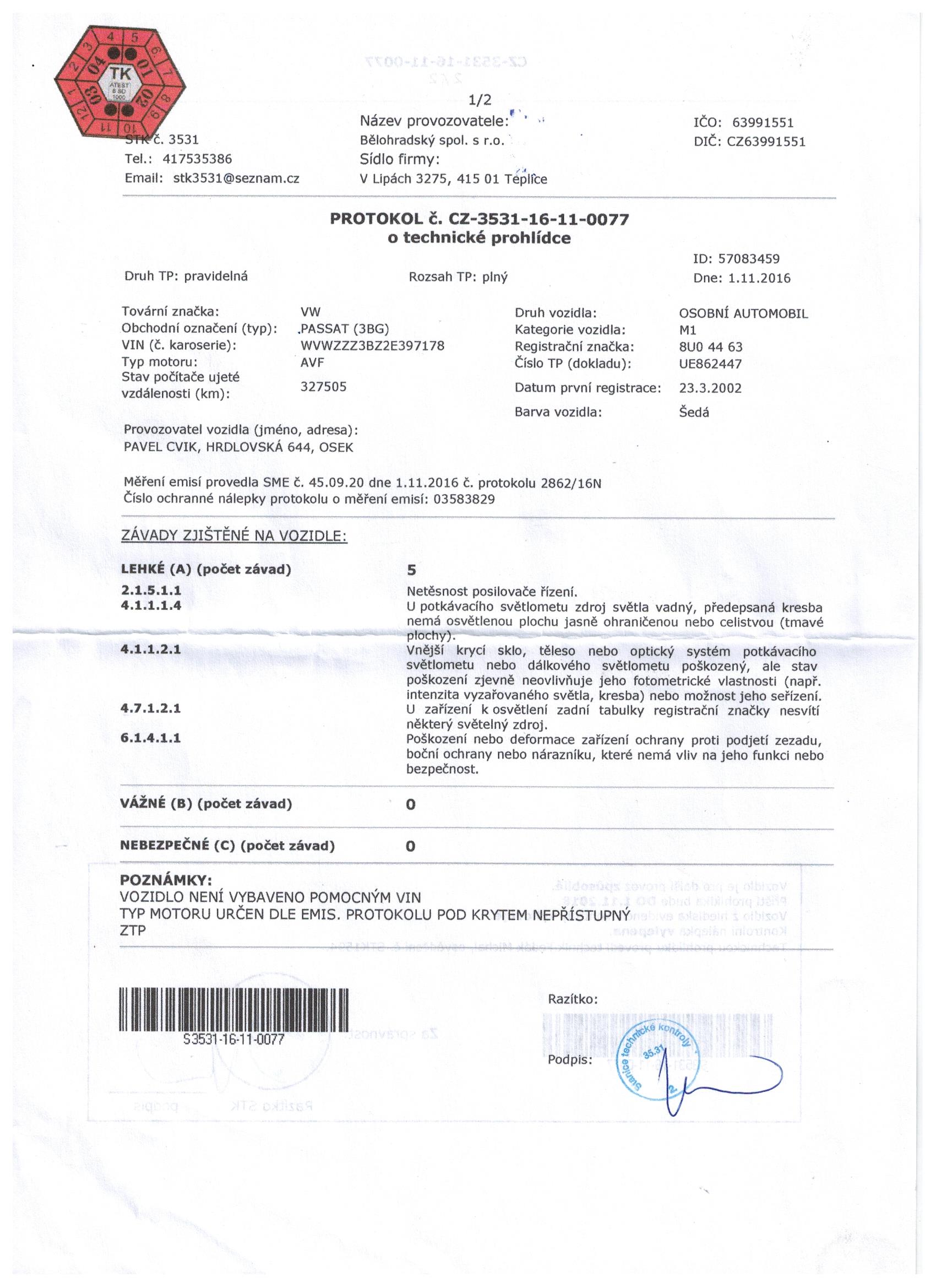 - osobní automobil kombi, zn. VOLKSWAGEN PASSAT VARIANT, RZ: 8U0 44 63, VIN: WVWZZZ3BZ2E397178, barva: šedá- metal, vybaven úpravou řízení pro postižené