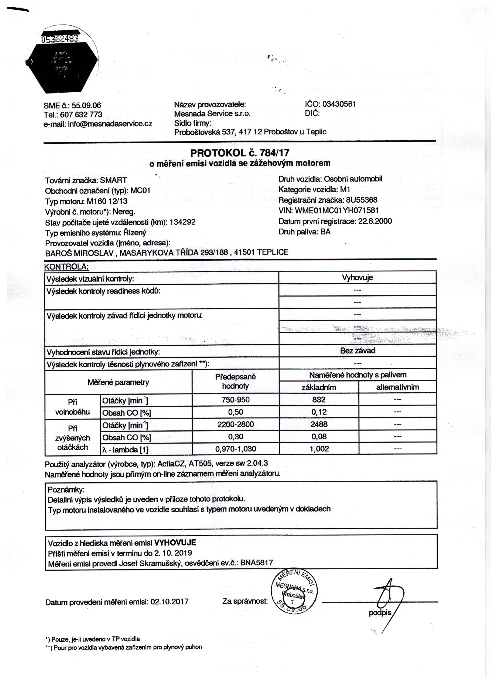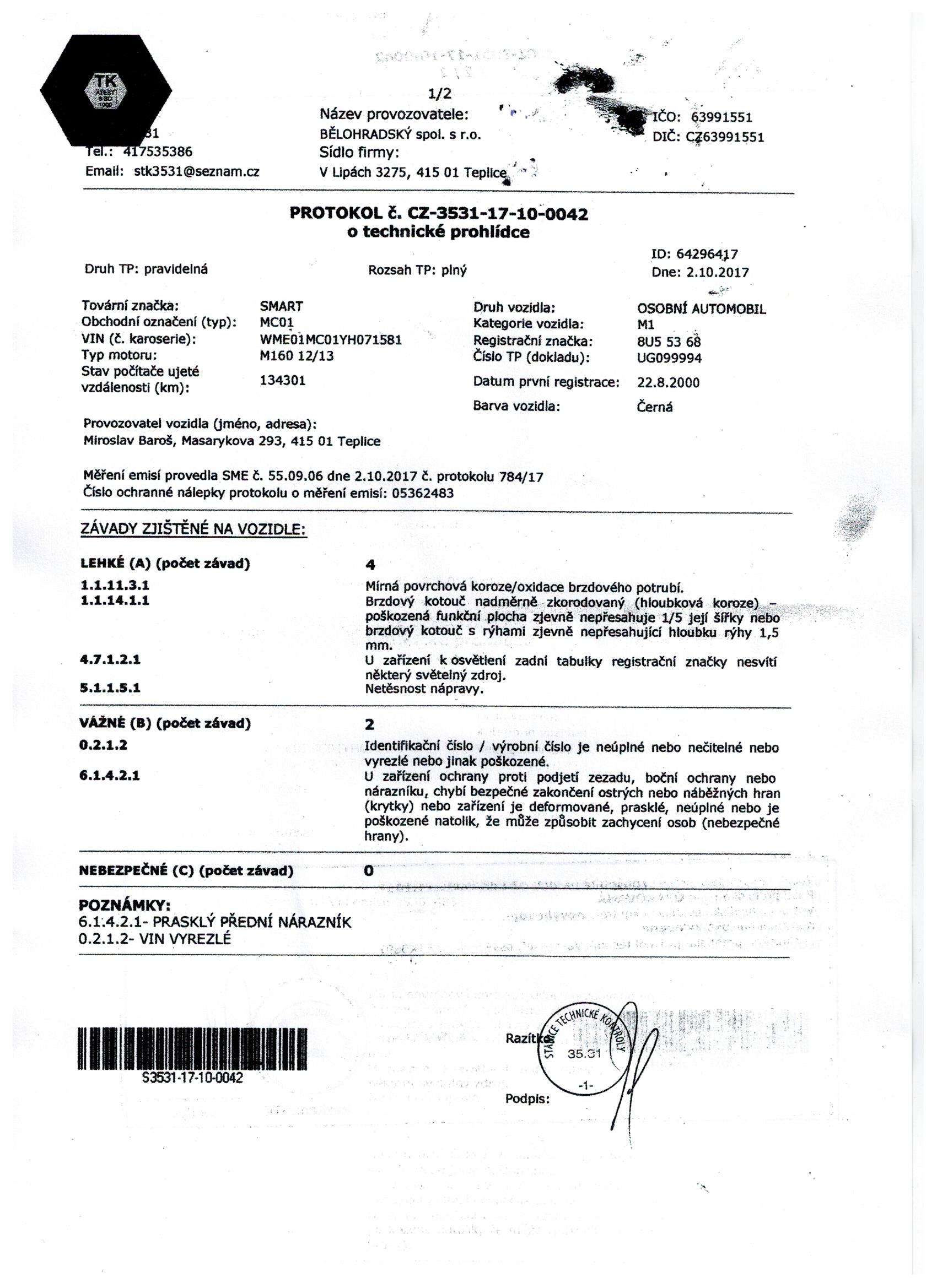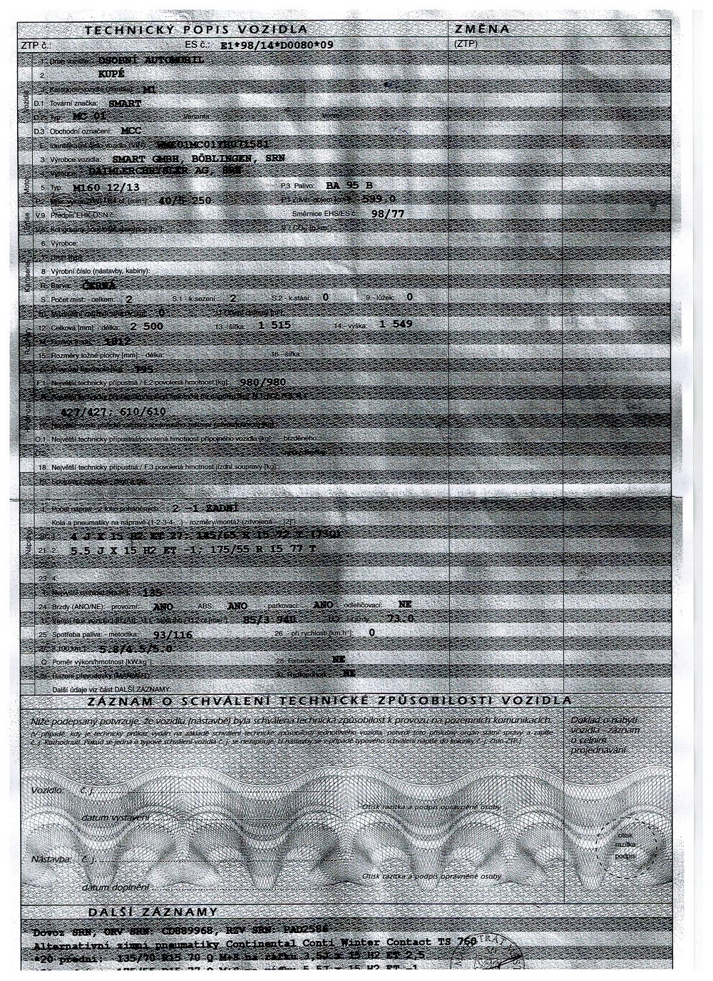 Osobní automobil zn. SMART MCC MC 01, datum prvního uvedení do provozu 22.8.2000, v ČR od 29.9.2015.