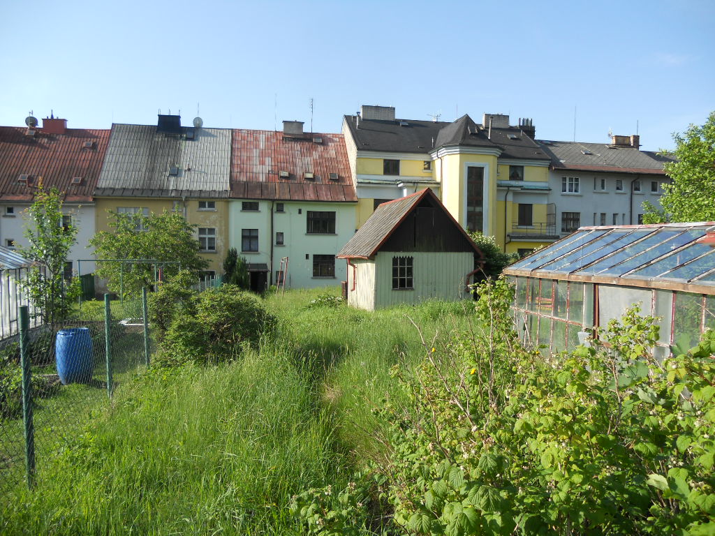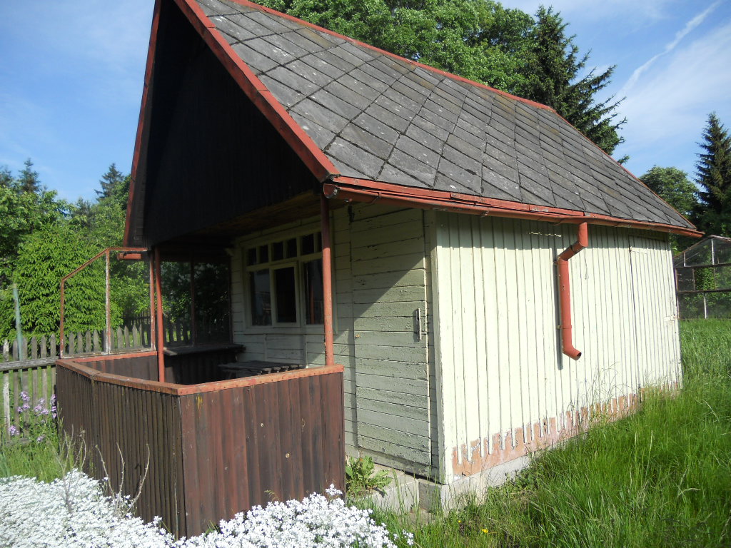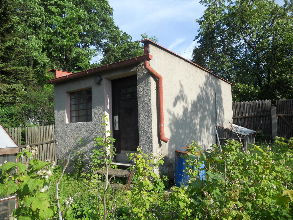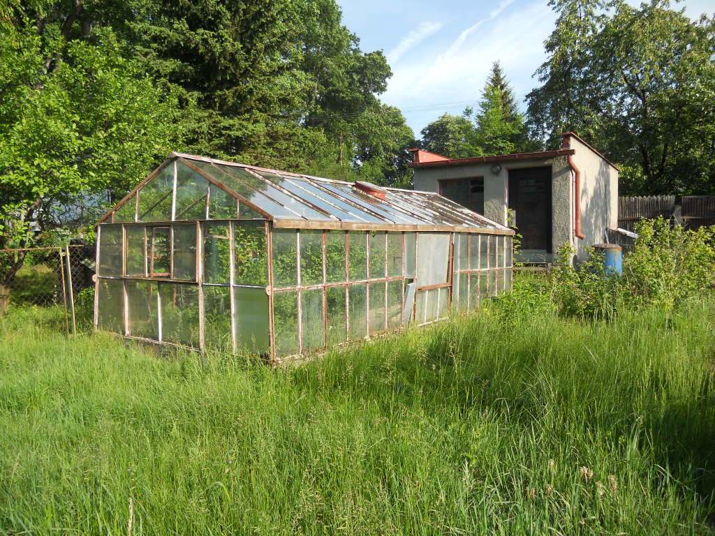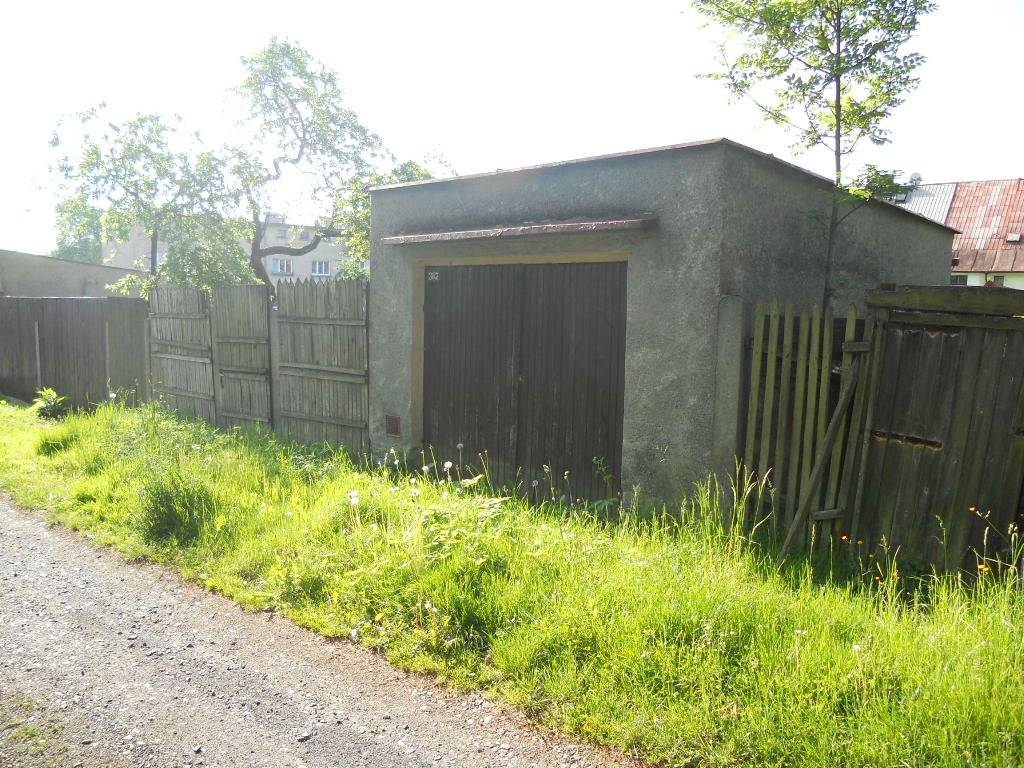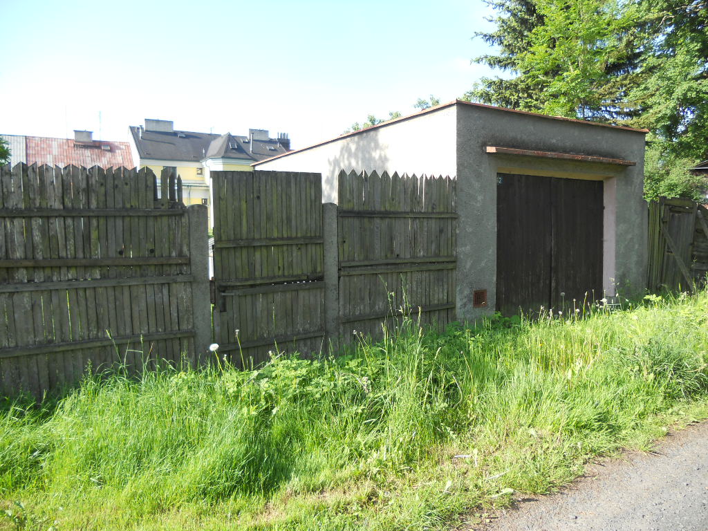 Pozemek je neudržovaný - zarostlý travou, jsou zde ovocné a okrasné keře. Oplocení tvoří v části pletivo do ocelových sloupků, v části dřevěný plot. Samotný pozemek je rovinatý. K objektu je bezproblémový přístup po zpevněné obecní cestě. Je zde možnost parkování na vlastním pozemku. K objektu náleží dřevěný zahradní domek na betonové podezdívce se sedlovou střechou, střešní krytinu tvoří eternitové šablony, oplechování a svody plechové s nátěrem. Odhadované stáří cca 40 let, stav dožitý. Dále k objektu náleží zděná garáž s plochou střechou – garáž nebylo možné prohlédnout uvnitř – stav se dohaduje pouze dle prohlídky z vně objektu. Střecha rovná, zřejmě tvoří krytinu živičná lepenka, oplechování a svody plechové s nátěrem, dveře a vrata dřevěné. Podlahy pravděpodobně betonové, omítky vápenocementové. Odhadované stáří 50 let, stav zanedbaný.