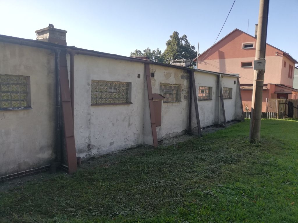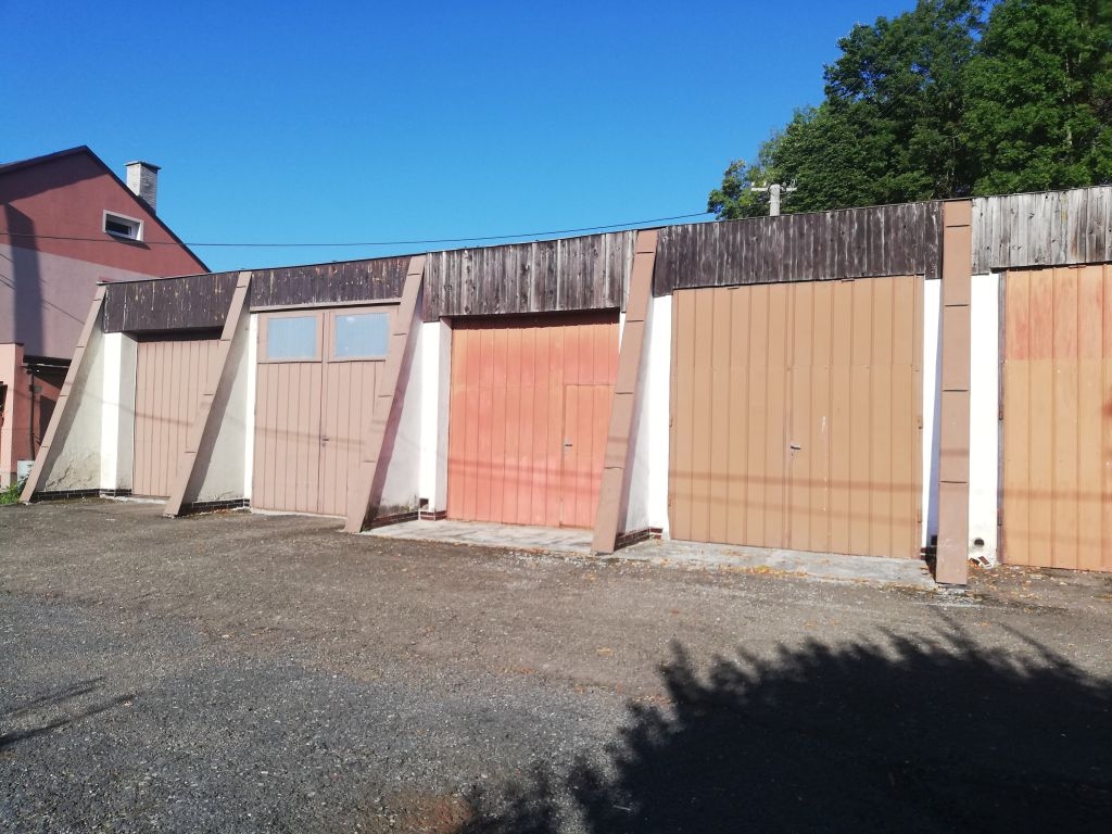 Garáž je přízemní, má jedno nadzemní podlaží. Odhadem byl objekt postaven v roce 1970. Základy jsou betonové bez izolace, konstrukce objektu je zděná. Má pultovou střechu, střešní krytina je tvořena živičnou lepenkou, s klempířskými prvky, které jsou plechové. Objekt má vápenocementové vnější omítky a objekt není zateplen. Zastavěná plocha je 28 m2. Okenní otvory jsou vyplněny luxfery, vrata jsou kovová dvoukřídlá. Stav garáže se jeví dobrý. Pozemek je bez porostů a není oplocen.